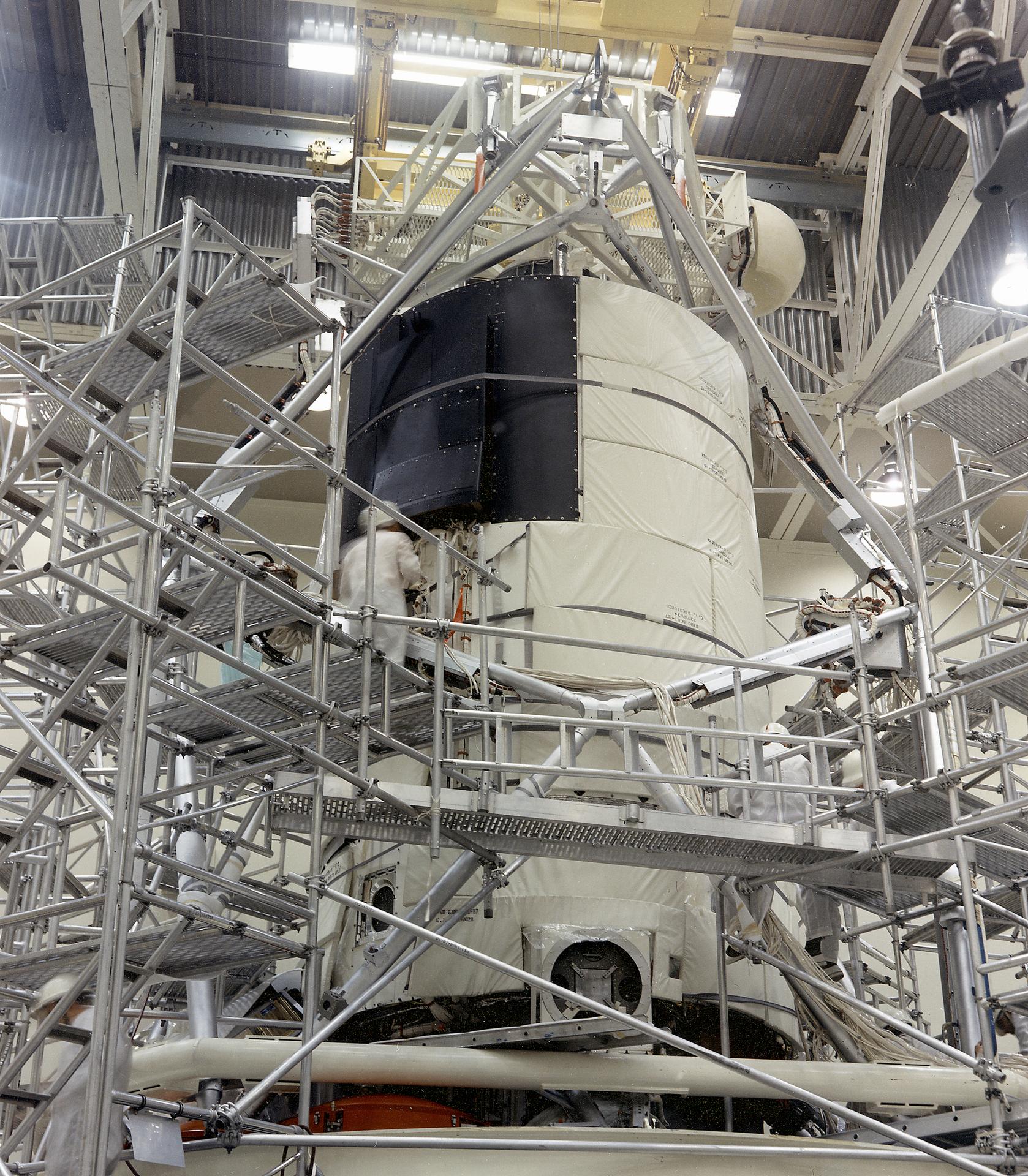 This photograph shows the flight article of the Airlock Module (AM)/Multiple Docking Adapter (MDA) assembly being readied for testing in a clean room at the McDornell Douglas Plant in St. Louis, Missouri. Although the AM and the MDA were separate entities, they were in many respects simply two components of a single module. The AM enabled crew members to conduct extravehicular activities outside Skylab as required for experiment support. Oxygen and nitrogen storage tanks needed for Skylab's life support system were mounted on the external truss work of the AM. Major components in the AM included Skylab's electric power control and distribution station, environmental control system, communication system, and data handling and recording systems. The MDA, forward of the AM, provided docking facilities for the Command and Service Module. It also accommodated several experiment systems, among them the Earth Resource Experiment Package, the materials processing facility, and the control and display console needed for the Apollo Telescope Mount solar astronomy studies. The AM was built by McDonnell Douglas and the MDA was built by Martin Marietta. The Marshall Space Flight Center was responsible for the design and development of the Skylab hardware and experiment management.