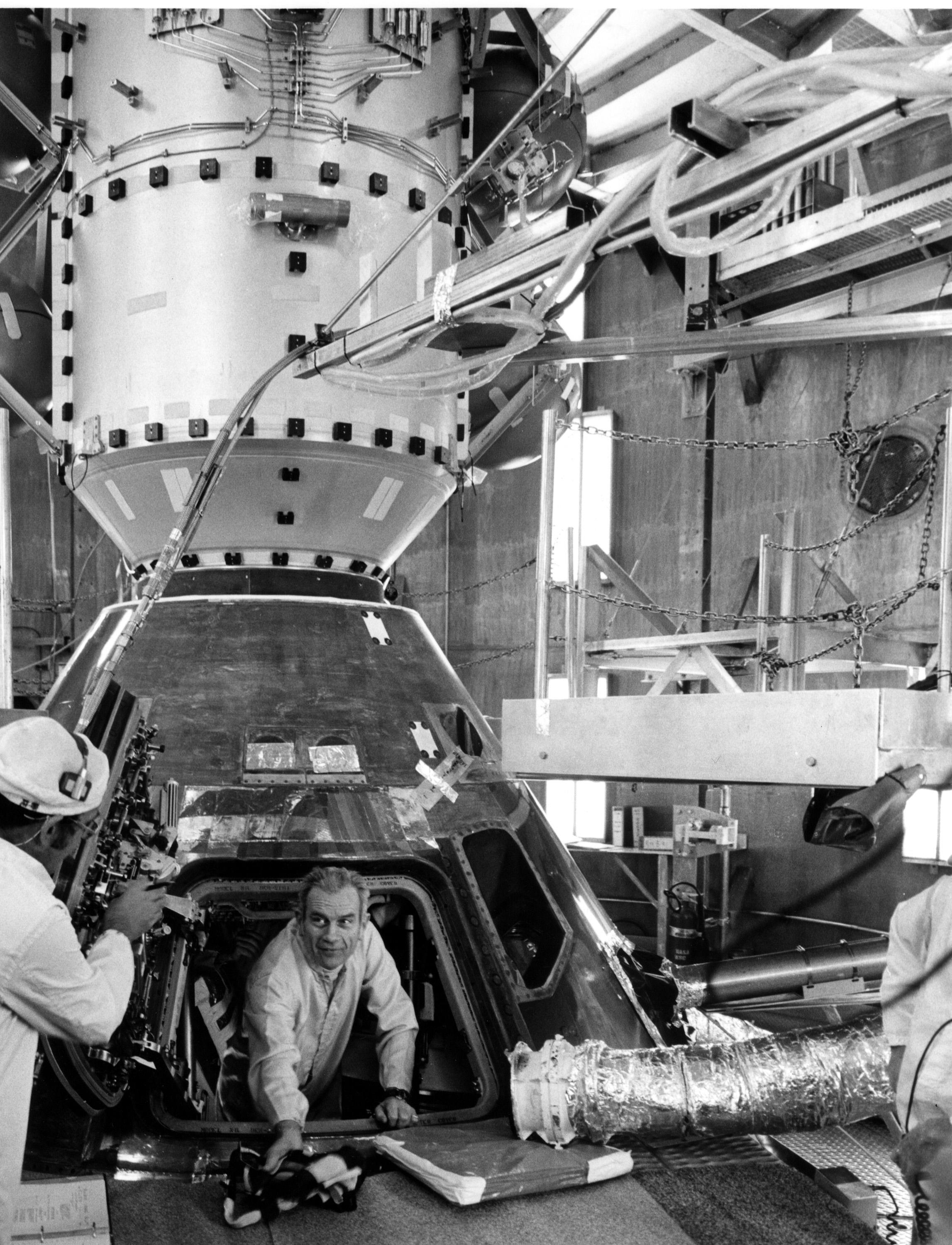 KENNEDY SPACE CENTER, FLA. -- Astronaut Donald Slayton is shown in the Apollo Command Module for July's Apollo-Soyuz Test Project space mission. Slayton was at KSC for fit checks between the Apollo and the Docking Module, which will be used during the mission as a link between the Soviet Soyuz and American Apollo.