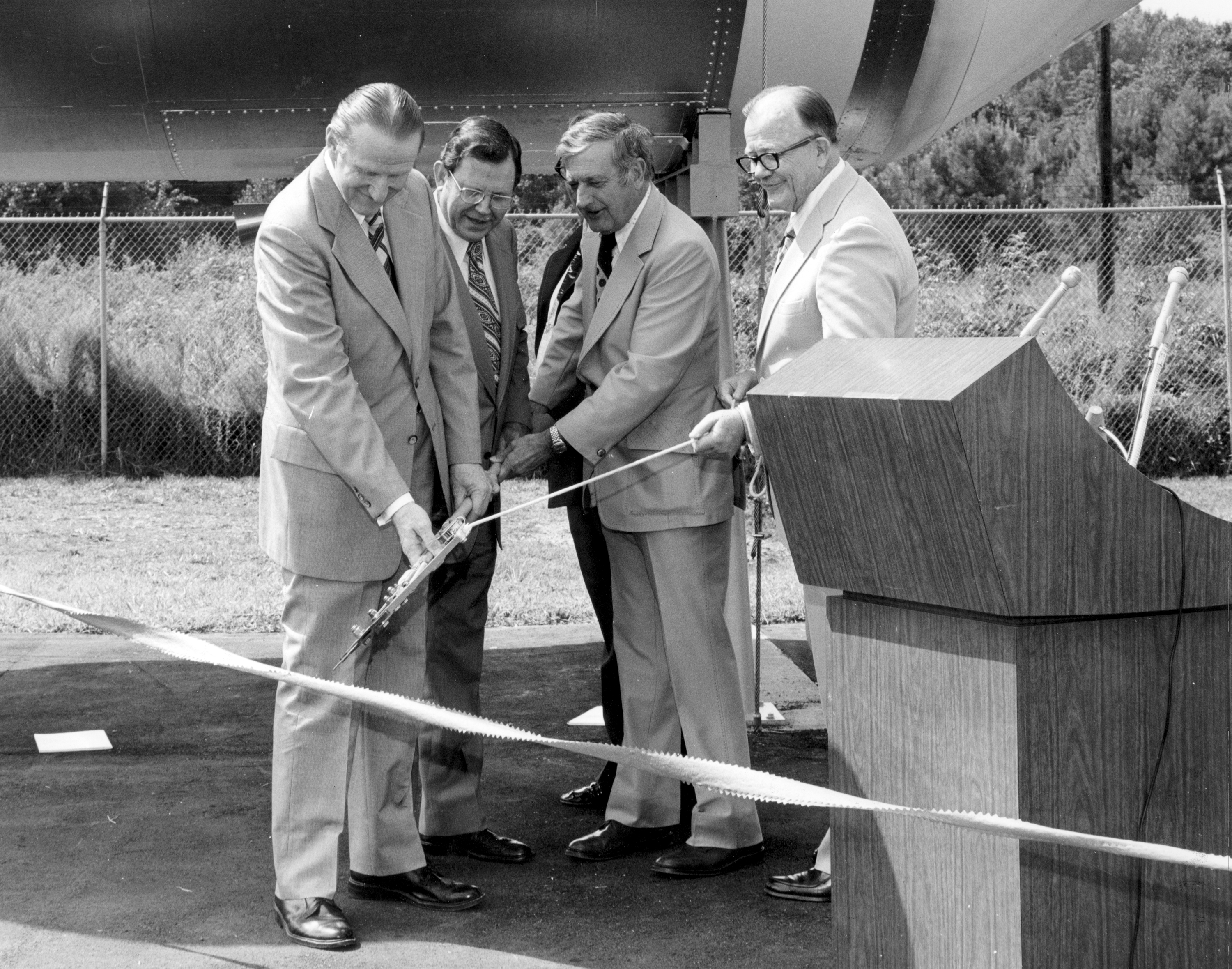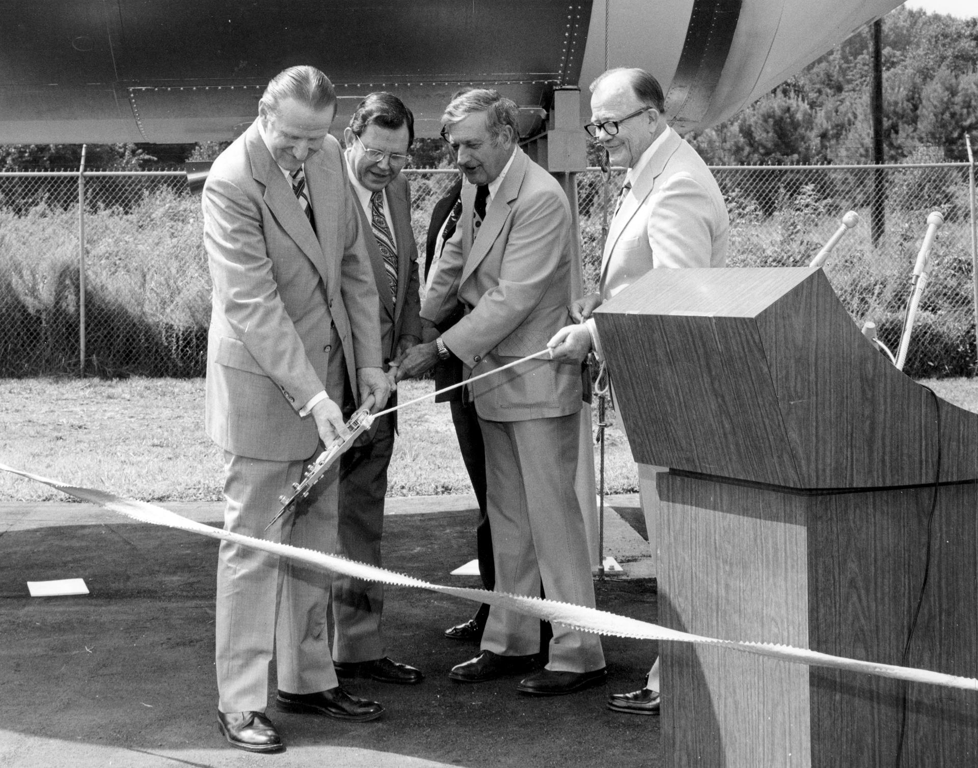 A metal strap became tangled over one of the folded solar array panels when Skylab lost its micro meteoroid shield during its launch. Cutters like the ones used to free the solar array were used to cut the ribbon opening to the public a new full-scale Skylab cluster exhibit at the Alabama Space and Rocket Center in Huntsville, Alabama. Wielding the cutters are (left to right): Alabama Senator James B. Allen; Marshall Space Flight Center director, Dr. William R. Lucas, Huntsville Mayor, Joe Davis; Madison County Commission Chairman, James Record (standing behind Mayor Davis); and chairman of the Alabama Space Science Exhibit Commission, Jack Giles. Astronauts Conrad and Kerwin used the same type of tool in Earth orbit to cut the aluminum strap which jammed the Skylab solar array.