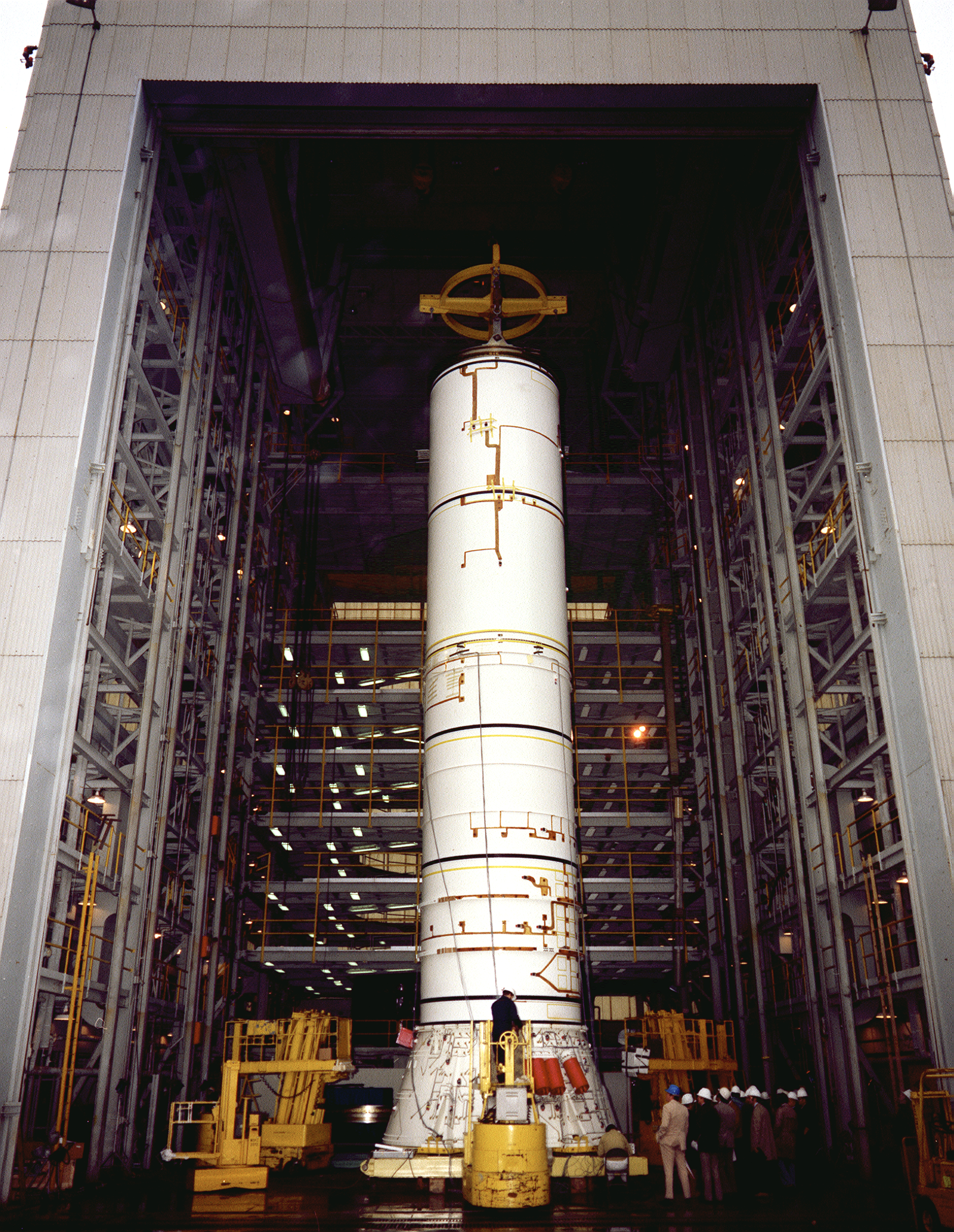 The structural test article to be used in the solid rocket booster (SRB) structural and load verification tests is being assembled in a high bay building of the Marshall Space Flight Center (MSFC). The Shuttle's two SRB's are the largest solids ever built and the first designed for refurbishment and reuse. Standing nearly 150-feet high, the twin boosters provide the majority of thrust for the first two minutes of flight, about 5.8 million pounds, augmenting the Shuttle's main propulsion system during liftoff. The major design drivers for the solid rocket motors (SRM's) were high thrust and reuse. The desired thrust was achieved by using state-of-the-art solid propellant and by using a long cylindrical motor with a specific core design that allows the propellant to burn in a carefully controlled marner. At burnout, the boosters separate from the external tank and drop by parachute to the ocean for recovery and subsequent refurbishment.