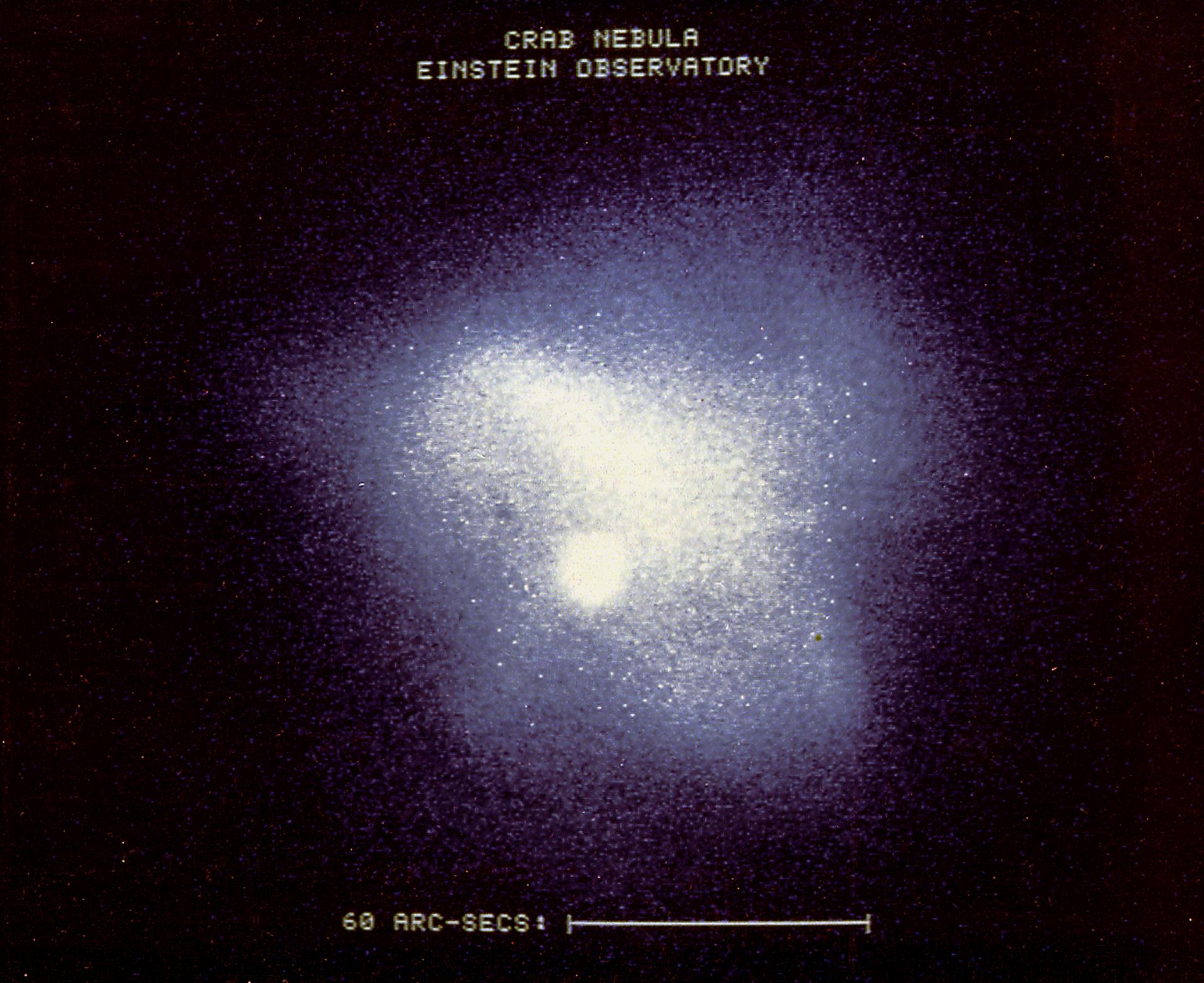 This is an x-ray image of the Crab Nebula taken with the High Energy Astronomy Observatory (HEAO)-2/Einstein Observatory. The image is demonstrated by a pulsar, which appears as a bright point due to its pulsed x-ray emissions. The strongest region of diffused emissions comes from just northwest of the pulsar, and corresponds closely to the region of brightest visible-light emission. The HEAO-2, the first imaging and largest x-ray telescope built to date, was capable of producing actual photographs of x-ray objects. Shortly after launch, the HEAO-2 was nicknamed the Einstein Observatory by its scientific experimenters in honor of the centernial of the birth of Albert Einstein, whose concepts of relativity and gravitation have influenced much of modern astrophysics, particularly x-ray astronomy. The HEAO-2, designed and developed by TRW, Inc. under the project management of the Marshall Space Flight Center, was launched aboard an Atlas/Centaur launch vehicle on November 13, 1978.