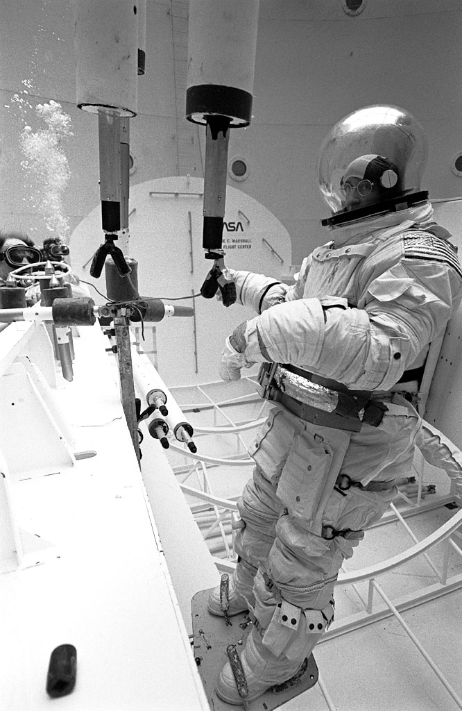 Once the United States' space program had progressed from Earth's orbit into outerspace, the prospect of building and maintaining a permanent presence in space was realized. To accomplish this feat, NASA launched a temporary workstation, Skylab, to discover the effects of low gravity and weightlessness on the human body, and also to develop tools and equipment that would be needed in the future to build and maintain a more permanent space station. The structures, techniques, and work schedules had to be carefully designed to fit this unique construction site. The components had to be lightweight for transport into orbit, yet durable. The station also had to be made with removable parts for easy servicing and repairs by astronauts. All of the tools necessary for service and repairs had to be designed for easy manipulation by a suited astronaut. Construction methods had to be efficient due to the limited time the astronauts could remain outside their controlled environment. In lieu of all the specific needs for this project, an environment on Earth had to be developed that could simulate a low gravity atmosphere. A Neutral Buoyancy Simulator (NBS) was constructed by NASA's Marshall Space Flight Center (MSFC) in 1968. Since then, NASA scientists have used this facility to understand how humans work best in low gravity and also provide information about the different kinds of structures that can be built. Pictured is a Massachusetts Institute of Technology (MIT) student working in a spacesuit on the Experimental Assembly of Structures in Extravehicular Activity (EASE) project which was developed as a joint effort between MFSC and MIT. The EASE experiment required that crew members assemble small components to form larger components, working from the payload bay of the space shuttle. The MIT student in this photo is assembling two six-beam tetrahedrons.
