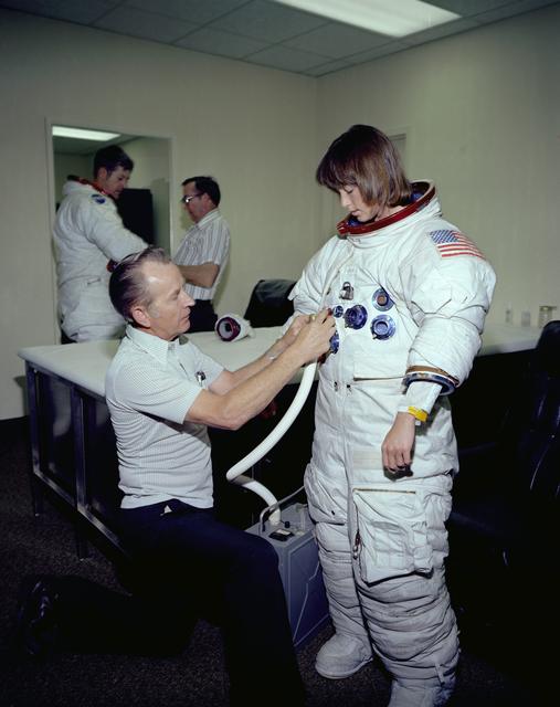 The Hubble Space Telescope (HST) is a cooperative program of the European Space Agency (ESA) and the National Aeronautical and Space Administration (NASA) to operate a long-lived space-based observatory. It was the flagship mission of NASA's Great Observatories program. The HST program began as an astronomical dream in the 1940s. During the 1970s and 1980s, the HST was finally designed and built becoming operational in the 1990s. The HST was deployed into a low-Earth orbit on April 25, 1990 from the cargo bay of the Space Shuttle Discovery (STS-31). The design of the HST took into consideration its length of service and the necessity of repairs and equipment replacement by making the body modular. In doing so, subsequent shuttle missions could recover the HST, replace faulty or obsolete parts and be re-released. Marshall Space Flight Center’s (MSFC's) Neutral Buoyancy Simulator (NBS) served as the test center for shuttle astronauts training for Hubble related missions. Shown is astronaut Anna Fisher suiting up for training on a mockup of a modular section of the HST for an axial scientific instrument change out.