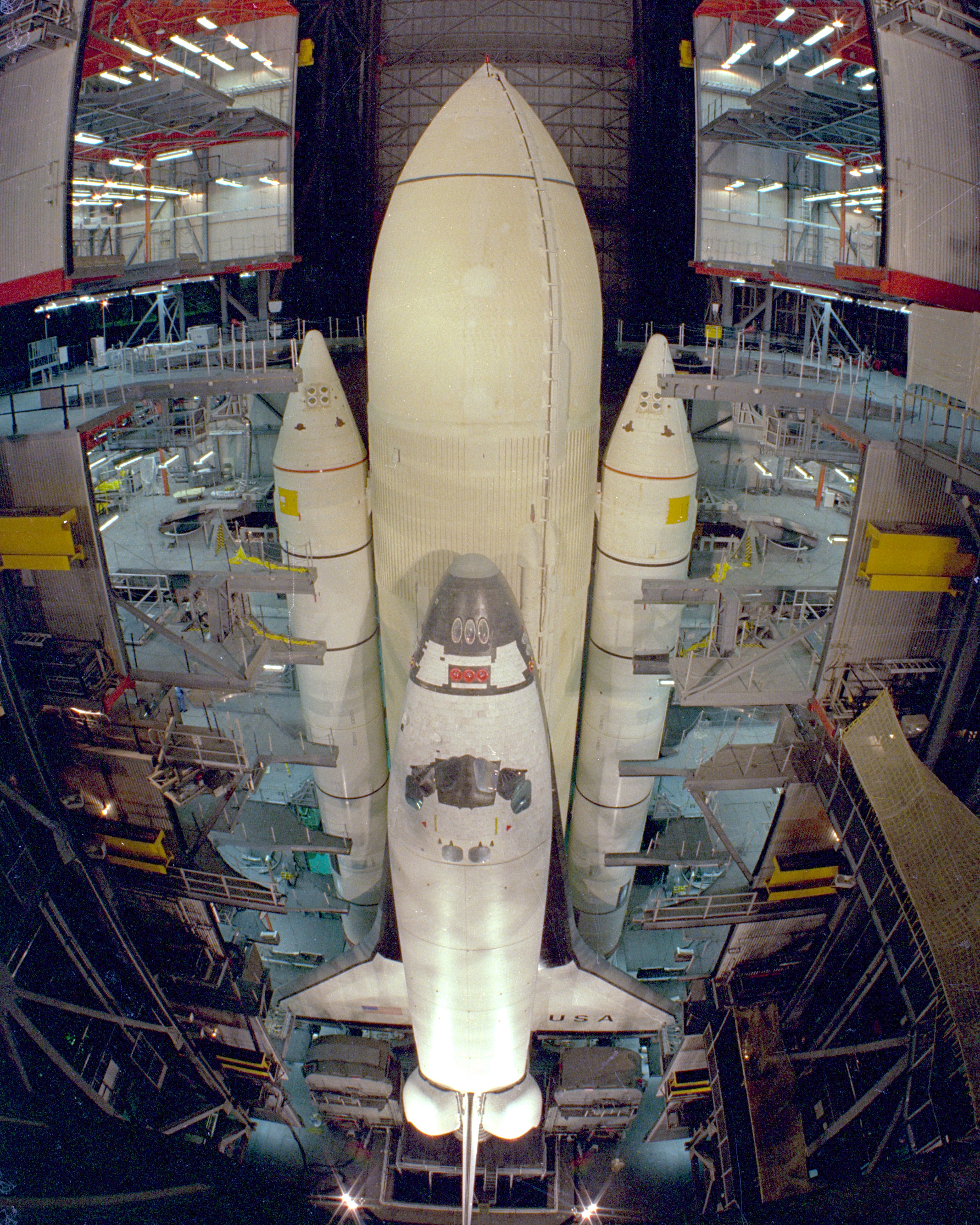 KENNEDY SPACE CENTER, FLA. - Assembly of the first Space Shuttle vehicle, scheduled to make its first orbital test flight in March 1981, was completed today with the mating of the Orbiter Columbia to its eternal tank in the Vehicle Assembly Building's High Bay 3. Columbia, shown here still attached to its hoisting sling, was moved to the VAB on Nov. 24 having completed tests and tile installation in the adjacent Orbiter Processing Facility. The other Shuttle components, the twin solid rocket boosters and the external propellant tank, were stacked on the Mobile launcher Platform in High Bay 3 in January and November of this year, respectively. The current schedule calls for the rollout of the assembled Space Shuttle to Pad A at Launch Complex 39 shortly after Christmas.