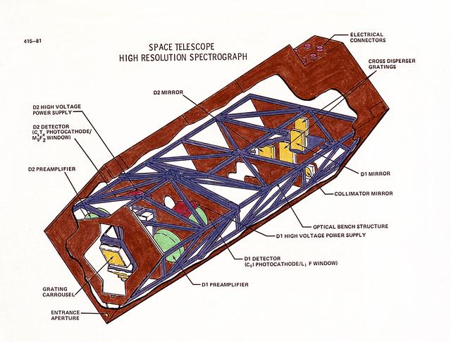 This drawing illustrates the Hubble Space Telescope's (HST's), Goddard High-Resolution Spectrograph (GHRS). The HST's two spectrographs, the GHRS and the Faint Object Spectrograph (FOS), can detect a broader range of wavelengths than is possible from Earth because there is no atmosphere to absorb certain wavelengths. Scientists can determine the chemical composition, temperature, pressure, and turbulence of the stellar atmosphere producing the light, all from spectral data. The GHRS can detect fine details in the light from somewhat brighter objects but only ultraviolet light. Both spectrographs operate in essentially the same way. The incoming light passes through a small entrance aperture, then passes through filters and diffraction gratings, that work like prisms. The filter or grating used determines what range of wavelength will be examined and in what detail. Then the spectrograph detectors record the strength of each wavelength band and sends it back to Earth. The purpose of the HST, the most complex and sensitive optical telescope ever made, is to study the cosmos from a low-Earth orbit. By placing the telescope in space, astronomers are able to collect data that is free of the Earth's atmosphere. The HST views galaxies, stars, planets, comets, possibly other solar systems, and even unusual phenomena such as quasars, with 10 times the clarity of ground-based telescopes. The HST was deployed from the Space Shuttle Discovery (STS-31 mission) into Earth orbit in April 1990. The Marshall Space Flight Center had responsibility for design, development, and construction of the HST. The Perkin-Elmer Corporation, in Danbury, Cornecticut, developed the optical system and guidance sensors.