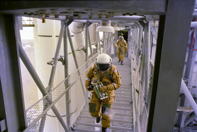 KENNEDY SPACE CENTER, FLA. - On the Fixed Service Structure on Launch Complex 39A, space shuttle prime and backup astronaut crews plus other astronauts and ground personnel are given training on the use of the emergency pad escape system known as the “slidewire”. The slidewire system provides a quick escape from upper launch pad platforms in case of a serious emergency. The flight crews wear the spacesuits and other equipment to be worn during a mission, but sandbags are used to duplicate the weight of riders in the slidewire baskets during the training. The STS-1 mission, known as a shuttle systems test flight, will seek to demonstrate safe launch into orbit and safe return of the orbiter and crew and verify the combined performance of the entire shuttle vehicle -- orbiter, solid rocket boosters and external tank. STS-1 will be launched from Pad A at the Kennedy Space Center's Launch Complex 39 no earlier than March 1981.