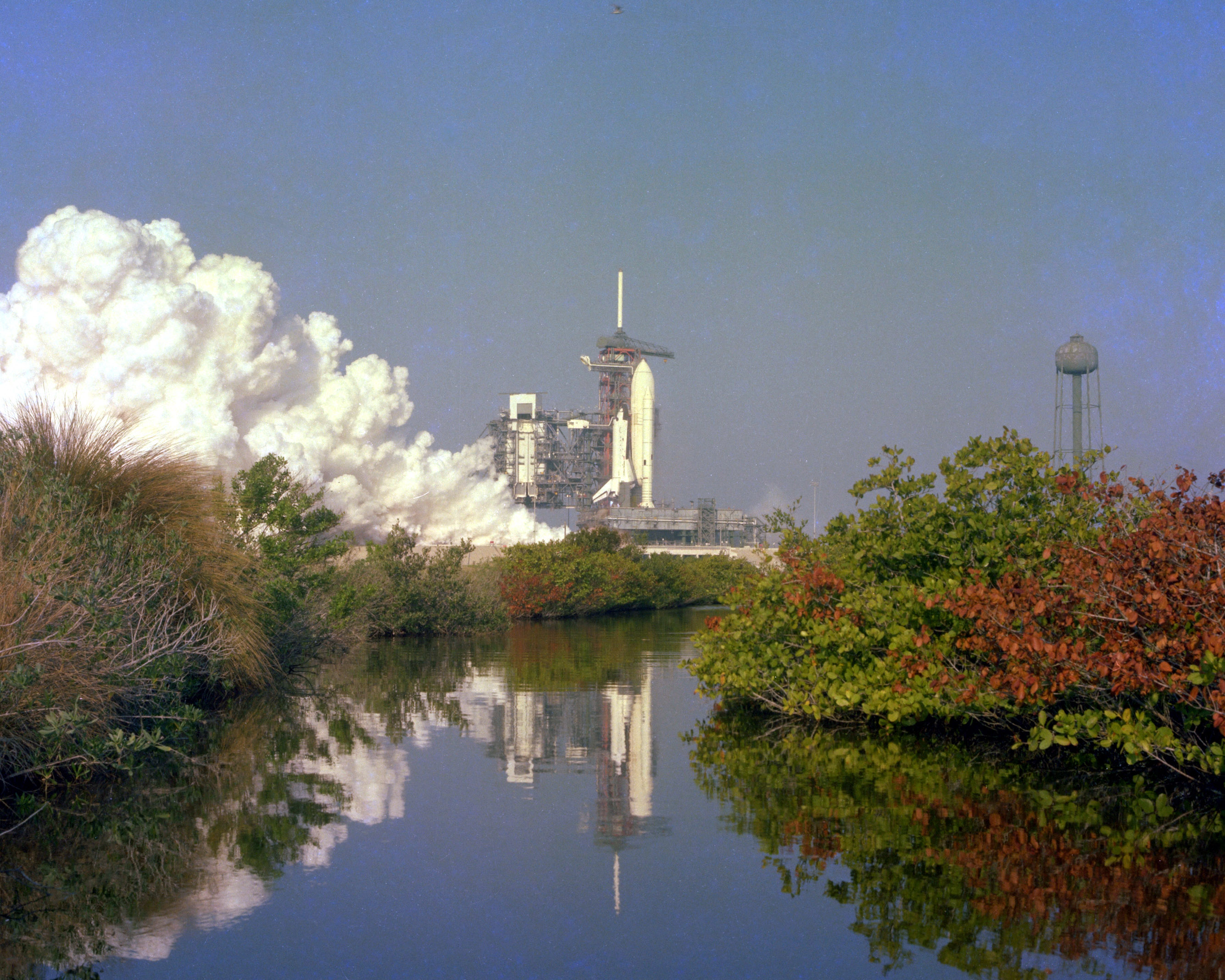 KENNEDY SPACE CENTER, FLA. - Flames shot from the nozzles of the Space Shuttle's three engines during the successful 20-second static firing, which capped a formal rehearsal for the maiden flight of Columbia, scheduled for early April. The milestone event took place at 8:45 a.m. on Feb. 20, 1981. The three main engines reached 100 percent power - over 1 million pounds of thrust - during the test. Holddown bolts secured the vehicle to its mobile launcher platform.