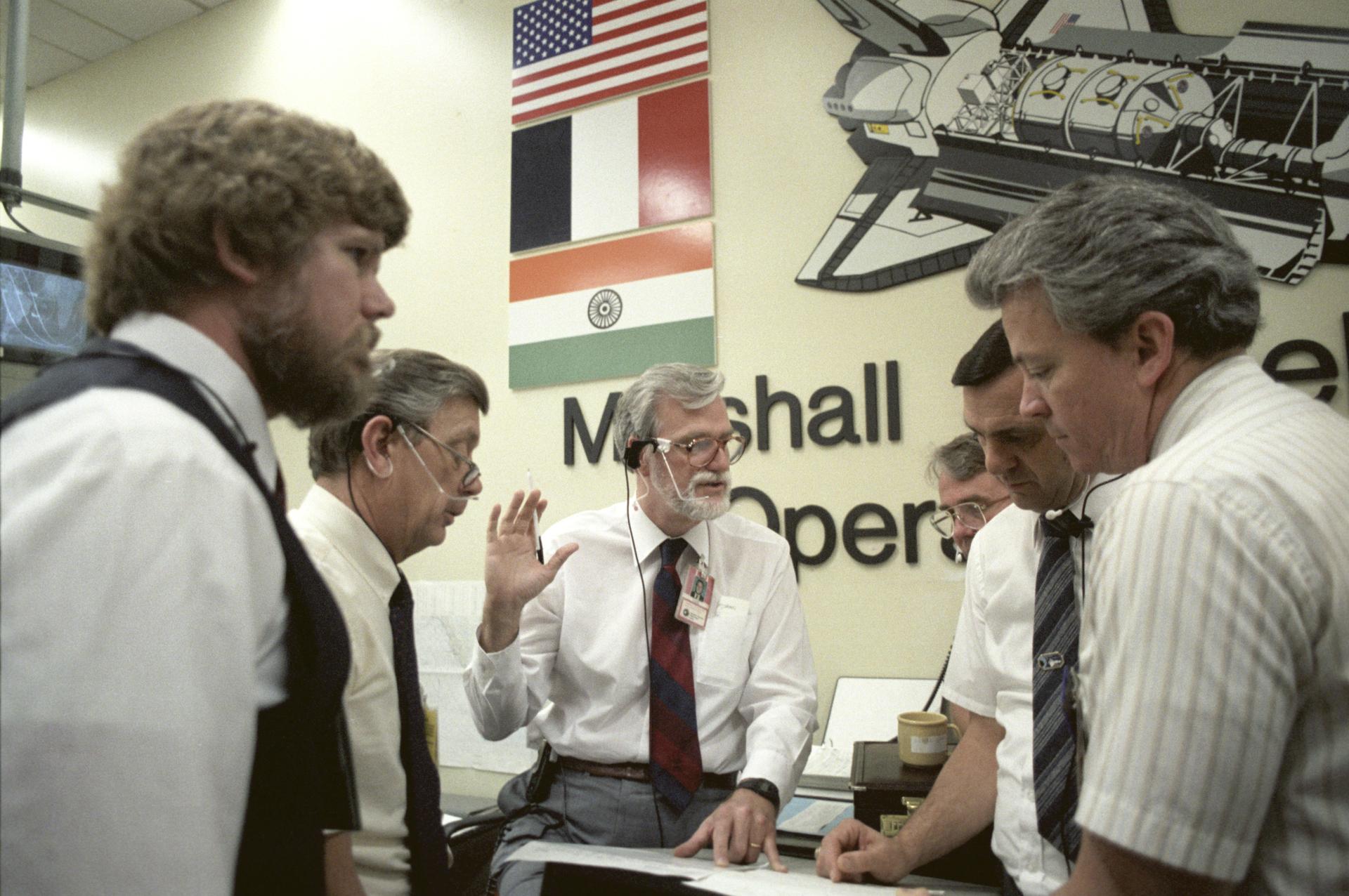 Spacelab-3 launched aboard STS-51B, with the major science objective being to perform engineering tests on two new facilities: the rodent animal holding facility and the primate animal holding facility. In addition, scientists observed the animals to obtain first hand knowledge of the effects of launch and reentry stresses and behavior. The need for suitable animal housing to support research in space led to the development of the Research Animal Holding Facility at the Ames Research Center. Scientists often study animals to find clues to human physiology and behavior. Rats, insects, and microorganisms had already been studied aboard the Shuttle on previous missions. On Spacelab-3, scientists had a chance to observe a large number of animals living in space in a specially designed and independently controlled housing facility. Marshall Space Flight Center (MSFC) had management responsibility for the Spacelab 3 mission. This photograph depicts activities during the mission at the Huntsville Operations Support Center (HOSC) Spacelab Payload Operations Control Center (SL POCC) at MSFC.