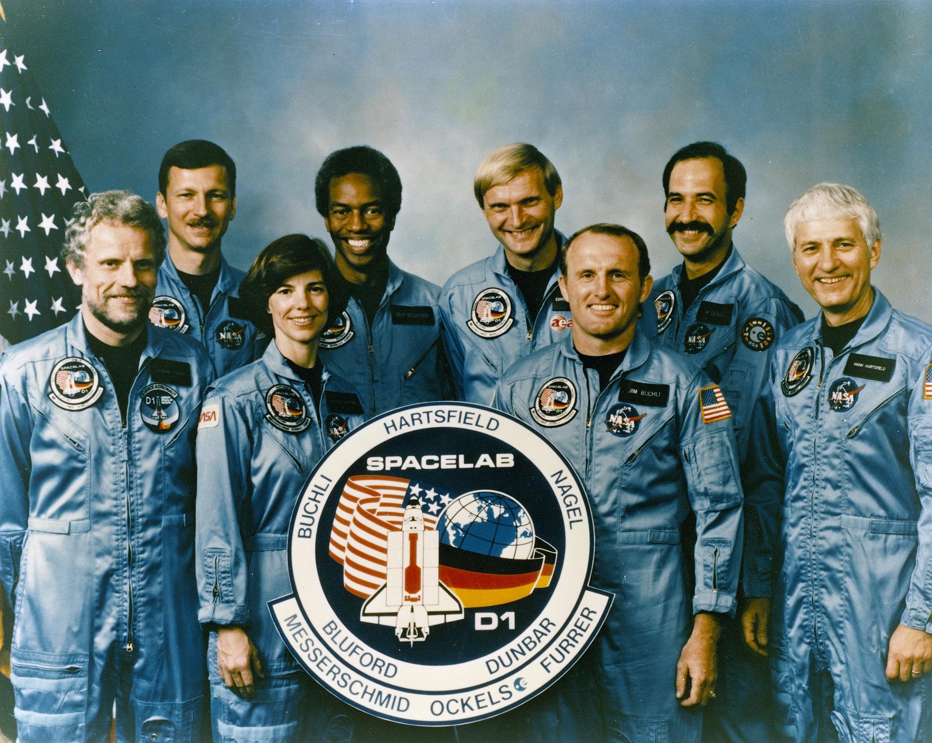 The crew assigned to the STS-61A mission included (front row left to right) Reinhard Furrer, German payload specialist; Bonnie J. Dunbar, mission specialist; and Henry W. Hartsfield, Jr. commander. On the back row, left to right, are Steven R. Nagel, pilot; Guion S. Bluford, mission specialist; Ernst Messerscmid, German payload specialist; and Wubbo J. Ockels, Dutch payload specialist. Launched aboard the Space Shuttle Challenger on October 30, 1985 at 12:00:00 noon (EST), the STS-61A mission’s primary payload was the Spacelab D-1 (German Spacelab mission).