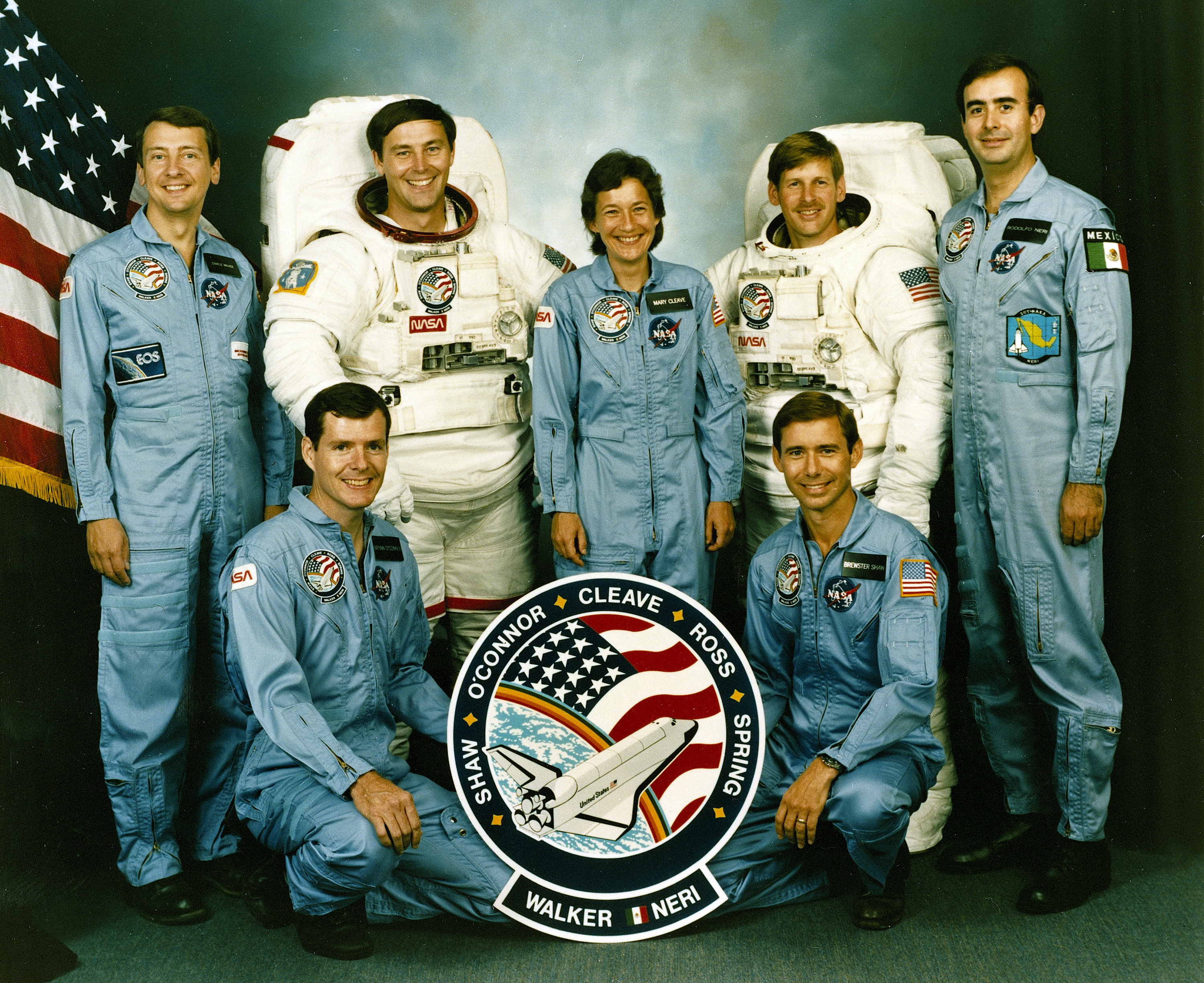 The crew assigned to the STS-61B mission included (kneeling left to right) Bryan D. O’conner, pilot; and Brewster H. Shaw, commander. On the back row, left to right, are Charles D. Walker, payload specialist; mission specialists Jerry L. Ross, Mary L. Cleave, and Sherwood C. Spring; and Rodolpho Neri Vela, payload specialist. Launched aboard the Space Shuttle Atlantis November 28, 1985 at 7:29:00 pm (EST), the STS-61B mission’s primary payload included three communications satellites: MORELOS-B (Mexico); AUSSAT-2 (Autralia); and SATCOM KU-2 (RCA Americom. Two experiments were conducted to test assembling erectable structures in space: EASE (Experimental Assembly of Structures in Extravehicular Activity), and ACCESS (Assembly Concept for Construction of Erectable Space Structure). In a joint venture between NASA/Langley Research Center in Hampton, VA and Marshall Space Flight Center (MSFC), the Assembly Concept for Construction of Erectable Space Structures (ACCESS) was developed and demonstrated at MSFC's Neutral Buoyancy Simulator (NBS). The primary objective of this experiment was to test the ACCESS structural assembly concept for suitability as the framework for larger space structures and to identify ways to improve the productivity of space construction.