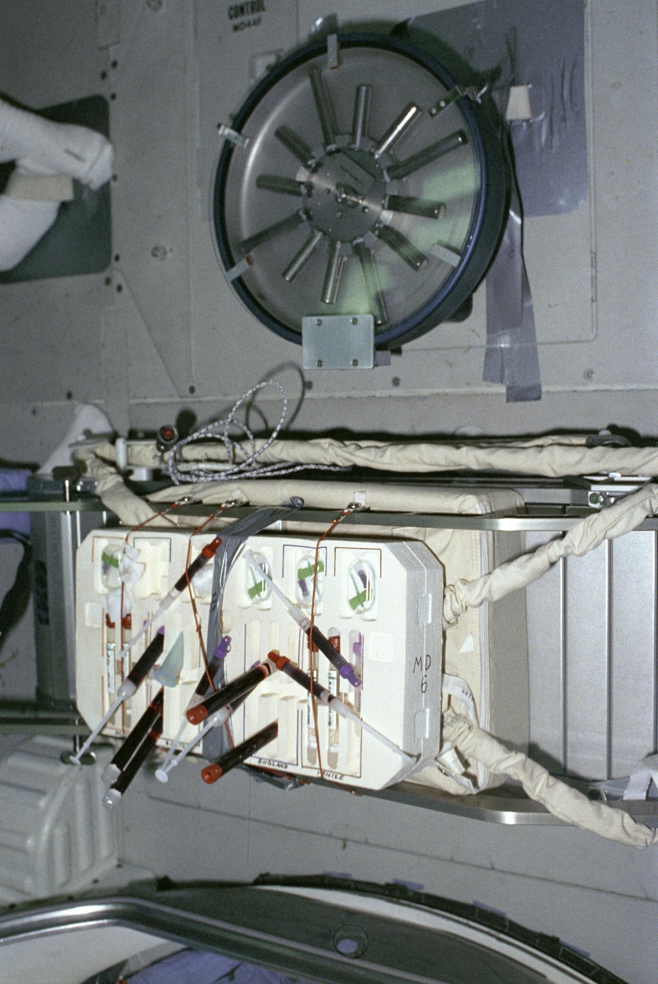 While instruments on the pallets in the payload bay observed the universe, biological experiments were performed in the middeck of the Shuttle Orbiter Challenger. Studying life processes in a microgravity environment can shed new light on the functioning of biological systems on Earth. These investigations can also help us understand how living organisms react to prolonged weightlessness. One such experiment was the vitamin D metabolites and bone demineralization experiment. This investigation measured the vitamin d metabolite levels of crew members to gain information on the cause of bone demineralization and mineral imbalance that occur during prolonged spaceflight as well as on Earth. Research into the biochemical nature of vitamin D has shown that the D-metabolites play a major role in regulating the body's calcium and phosphorus levels. One major function of the most biologically active vitamin D metabolite is to regulate the amount of calcium absorbed from the diet and taken out of bones. This investigation had two phases. The first was the developmental phase, which included extensive testing before flight, and the second, or final phase, involved the postflight analysis of the crew's blood samples. This photograph shows a blood draw test kit and centrifuge used for the experiment aboard the Spacelab-2. Marshall Space Flight Center had management responsibilities of all Spacelab missions.