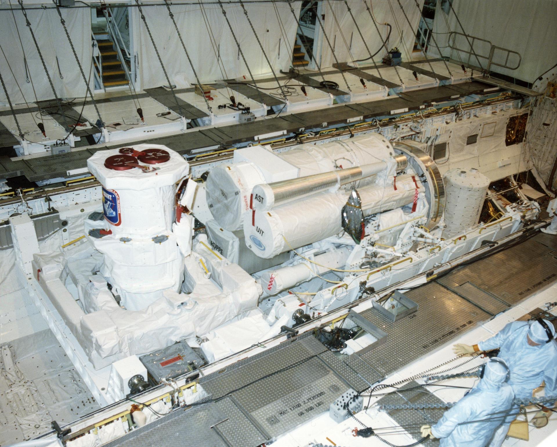 This photograph was taken during the integration of the Astro-1 mission payloads at the Kennedy Space Center on March 20, 1990, showing the Broad Band X-Ray Telescope (BBXRT) at the left, as three telescopes for the Astro-1 Observatory are settled into the Orbiter Columbia payload bay. Above Earth's atmospheric interference, Astro-1 would make precise measurements of objects such as planets, stars, and galaxies in relatively small fields of view and would observe and measure ultraviolet radiation from celestial objects. The Astro-1 used a Spacelab pallet system with an instrument pointing system and a cruciform structure for bearing the three ultraviolet instruments mounted in a parallel configuration. The three instruments were: The Hopkins Ultraviolet Telescope (HUT), which was designed to obtain far-ultraviolet spectroscopic data from white dwarfs, emission nebulae, active galaxies, and quasars; the Wisconsin Ultraviolet Photo-Polarimeter Experiment (WUPPE) which was to study polarized ultraviolet light from magnetic white dwarfs, binary stars, reflection nebulae, and active galaxies; and the Ultraviolet Imaging Telescope (UIT), which was to record photographic images in ultraviolet light of galaxies, star clusters, and nebulae. The star trackers that supported the instrument pointing system, were also mounted on the cruciform. Also in the payload bay was the Broad Band X-Ray Telescope (BBXRT), which was designed to obtain high-resolution x-ray spectra from stellar corona, x-ray binary stars, active galactic nuclei, and galaxy clusters. Managed by the Marshall Space Flight Center, the Astro-1 observatory was launched aboard the Space Shuttle Orbiter Columbia (STS-35) on December 2, 1990.