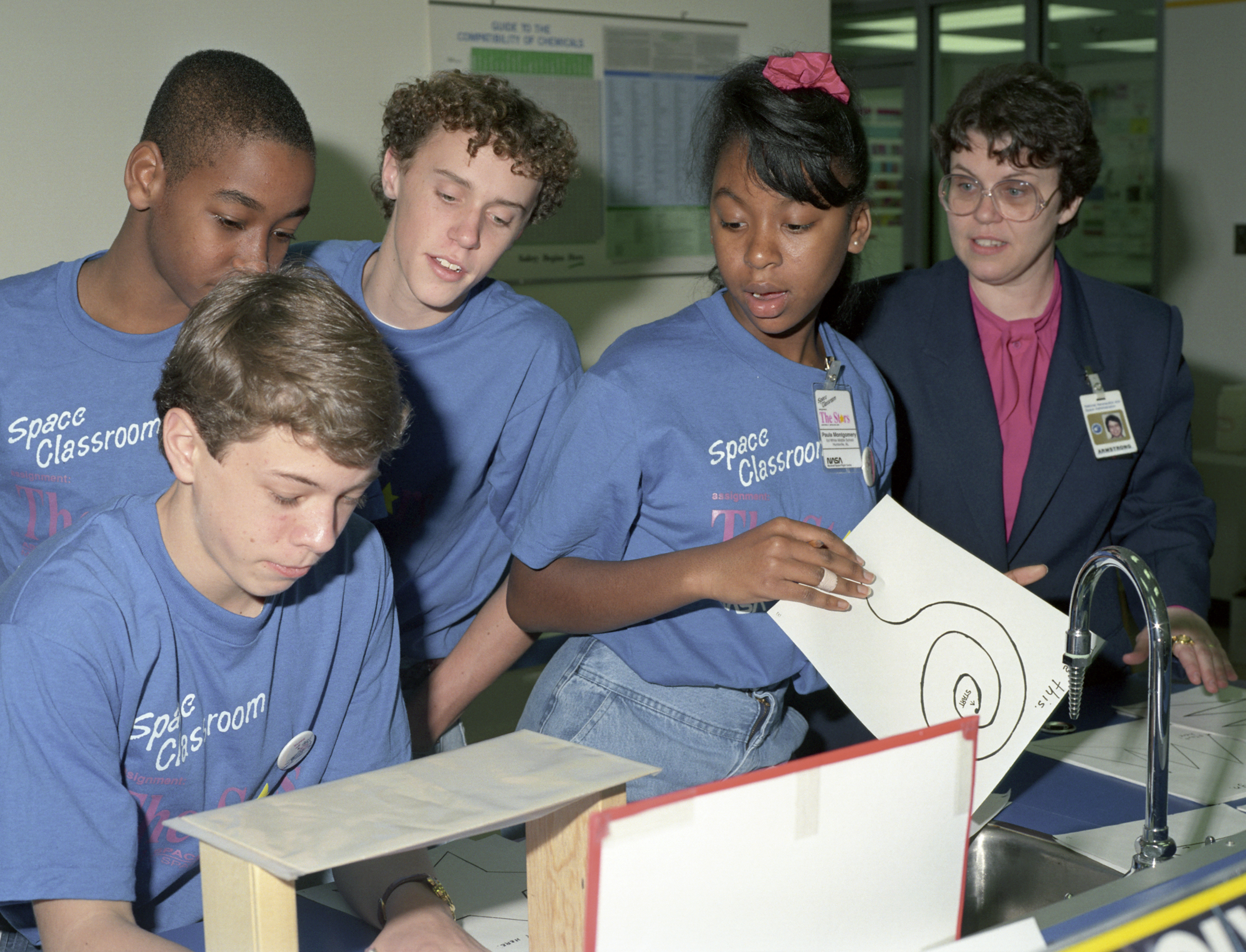 The primary objective of the STS-35 mission was round the clock observation of the celestial sphere in ultraviolet and X-Ray astronomy with the Astro-1 observatory which consisted of four telescopes: the Hopkins Ultraviolet Telescope (HUT); the Wisconsin Ultraviolet Photo-Polarimeter Experiment (WUPPE); the Ultraviolet Imaging Telescope (UIT); and the Broad Band X-Ray Telescope (BBXRT). The Huntsville Operations Support Center (HOSC) Spacelab Payload Operations Control Center (SL POCC) at the Marshall Space Flight Center (MSFC) was the air/ground communication channel used between the astronauts and ground control teams during the Spacelab missions. Teams of controllers and researchers directed on-orbit science operations, sent commands to the spacecraft, received data from experiments aboard the Space Shuttle, adjusted mission schedules to take advantage of unexpected science opportunities or unexpected results, and worked with crew members to resolve problems with their experiments. This photo is of Space classroom students in the Discovery Optics Lab at MSFC during STS-35, ASTRO-1 mission payload operations.