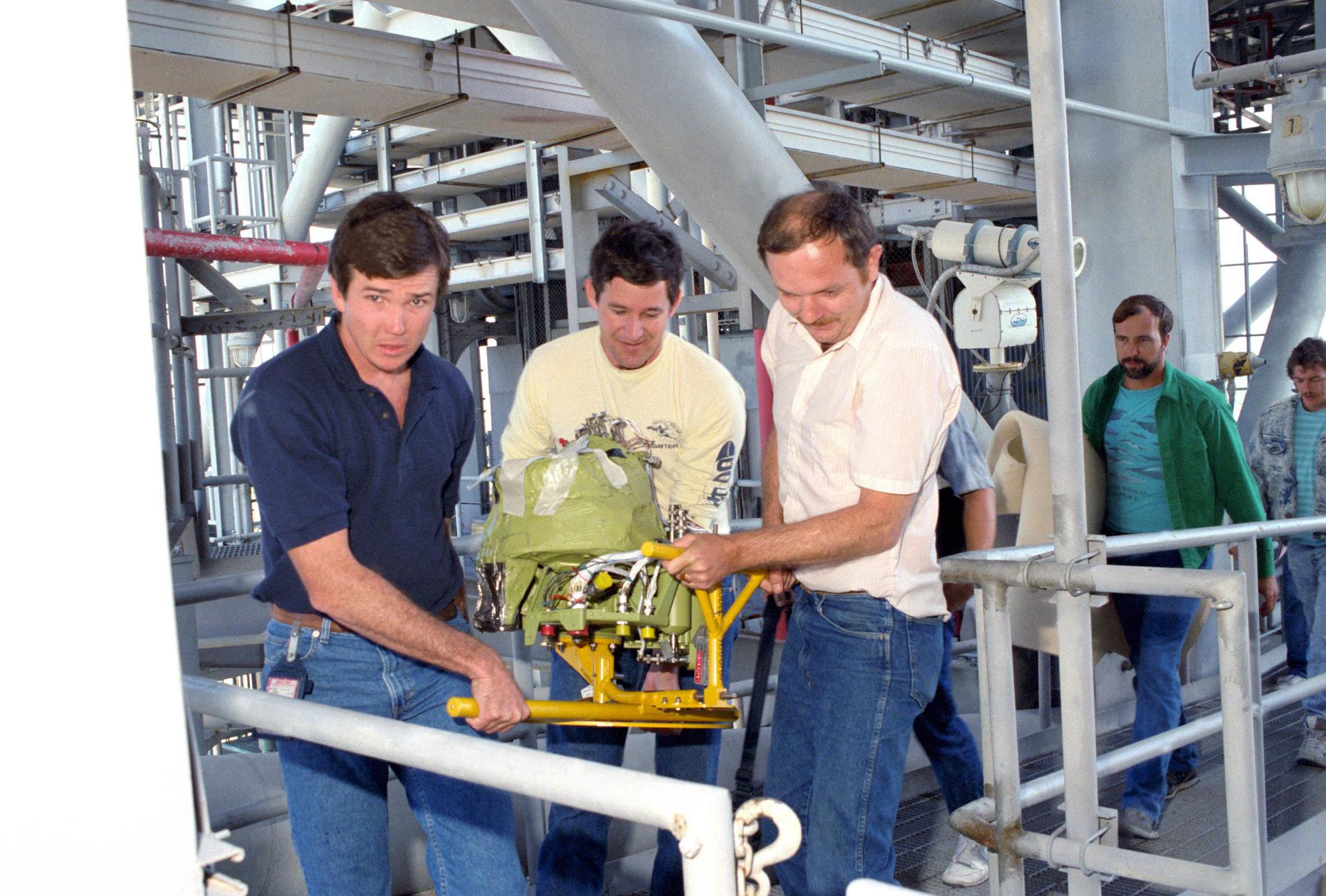 KENNEDY SPACE CENTER, FLA. -- Technicians at Pad 39-B carry a new Auxiliary Power Unit (APU) to be installed in the orbiter Discovery. It will replace APU #1 that failed during the STS-31 launch attempt on April 10.