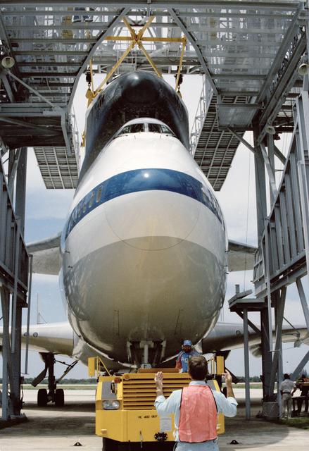 CAPE CANAVERAL, Fla. -- Space shuttle mission STS-31 comes full circle as the orbiter Discovery returns to KSC atop the shuttle carrier aircraft. Coaxing the duo into the mate_demate device at the SLF are John Goleno, driving the towing vehicle, and directing him, Peter Seidel. Photo credit: NASA