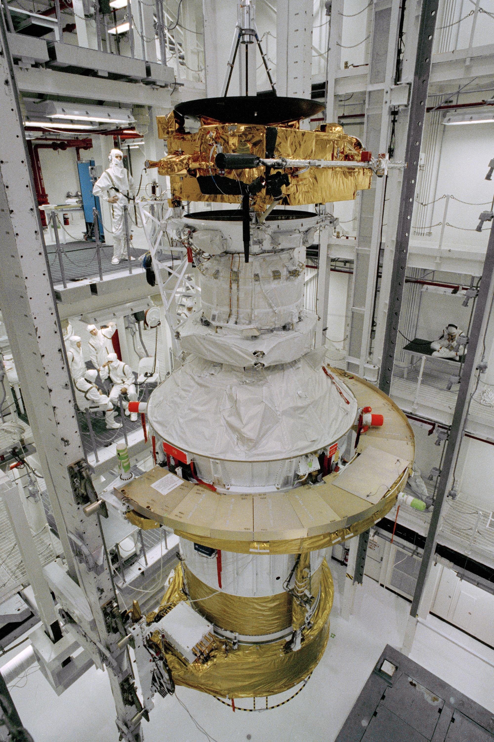 CAPE CANAVERAL, Fla. -- At the Kennedy Space Center in Florida, the Ulysses spacecraft with two attached upper stages –- a payload assist module and an inertial upper stage -- is transferred into the payload canister. Transport from the Vertical Processing Facility to the Payload Changeout Room at the Launch Pad 39B was scheduled for Aug. 27, 1990. The payload will be vertically installed in the cargo bay of the space shuttle Discovery after the shuttle is brought to the pad in September. Ulysses will be deployed during STS-41, set for a launch period extending from Oct. 5 through Oct. 23, 1990. Photo Credit: NASA