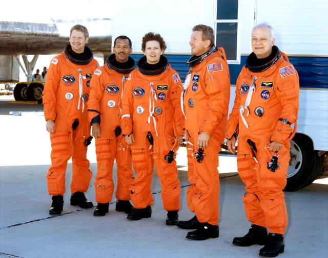DRYDEN FLIGHT RESEARCH FACILITY, EDWARDS, CALIF. -- STS-31 POST-LANDING CREW PORTRAIT -- The astronauts of STS-31 pose for a quick photo near the Space Shuttle Discovery following a smooth landing on the runway at Edwards Air Force Base to complete a highly successful five day mission. Picture, left to right, are Astronauts Steven A. Hawley, Charles F. Bolden Jr., Kathryn D. Sullivan, Loren J. Shriver, and Bruce McCandless II. Theirs was an Earth-orbital flight during which the Hubble Space Telescope was sent toward its 15-year mission. Landing was completed at 6:51 a.m. (PDT), April 29, 1990.