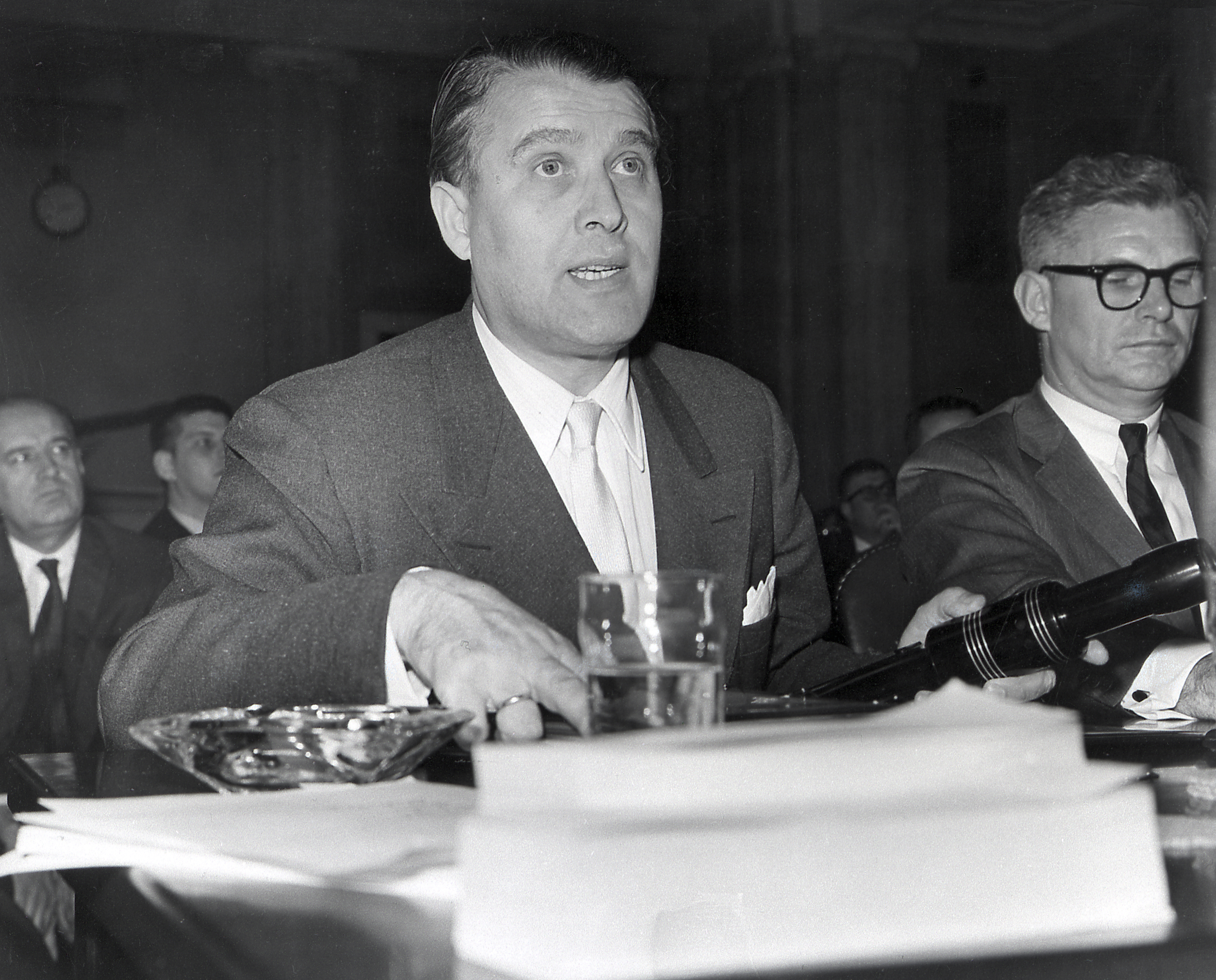 Dr. von Braun, Director of the Marshall Space Flight Center, spoke of the progress in the Saturn Program during his appearance before the Senate Committee on Aeronautical and Space Sciences. He was accompanied by Dr. Robert C. Seamans, Jr., Associate Administrator of the National Aeronautics and Space Administration (NASA).
