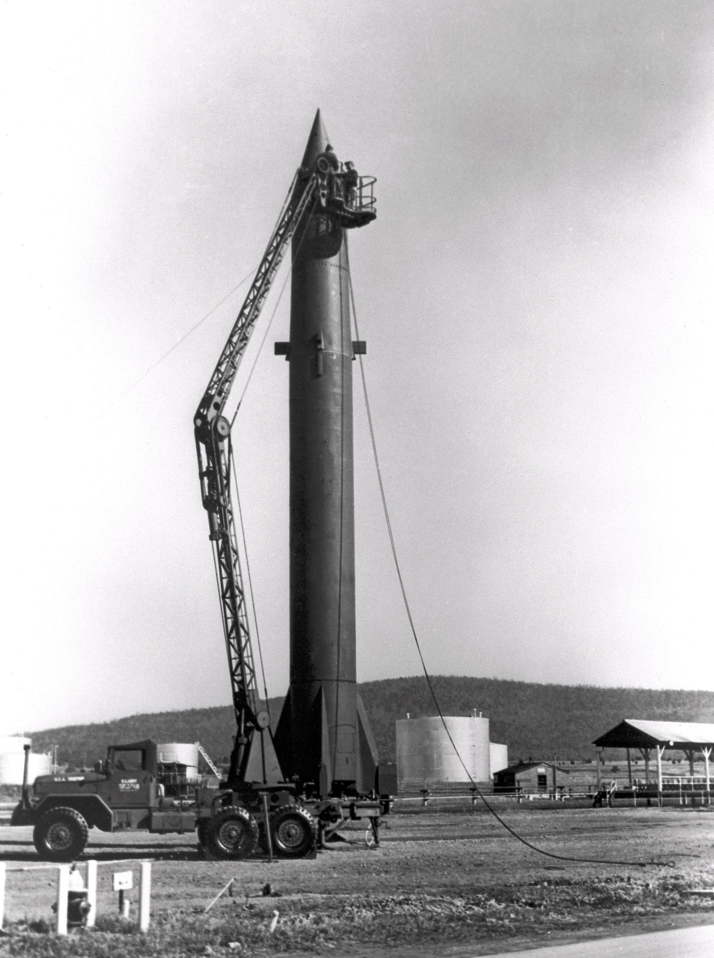 The image depicts Redstone missile being erected. The Redstone ballistic missile was a high-accuracy, liquid-propelled, surface-to-surface missile developed by Army Ballistic Missile Agency, Redstone Arsenal, in Huntsville, Alabama, under the direction of Dr. von Braun. The Redstone engine was a modified and improved version of the Air Force's Navaho cruise missile engine of the late forties. The A-series, as this would be known, utilized a cylindrical combustion chamber as compared with the bulky, spherical V-2 chamber. By 1951, the Army was moving rapidly toward the design of the Redstone missile, and the production was begun in 1952. Redstone rockets became the "reliable workhorse" for America's early space program. As an example of the versatility, Redstone was utilized in the booster for Explorer 1, the first American satellite, with no major changes to the engine or missile