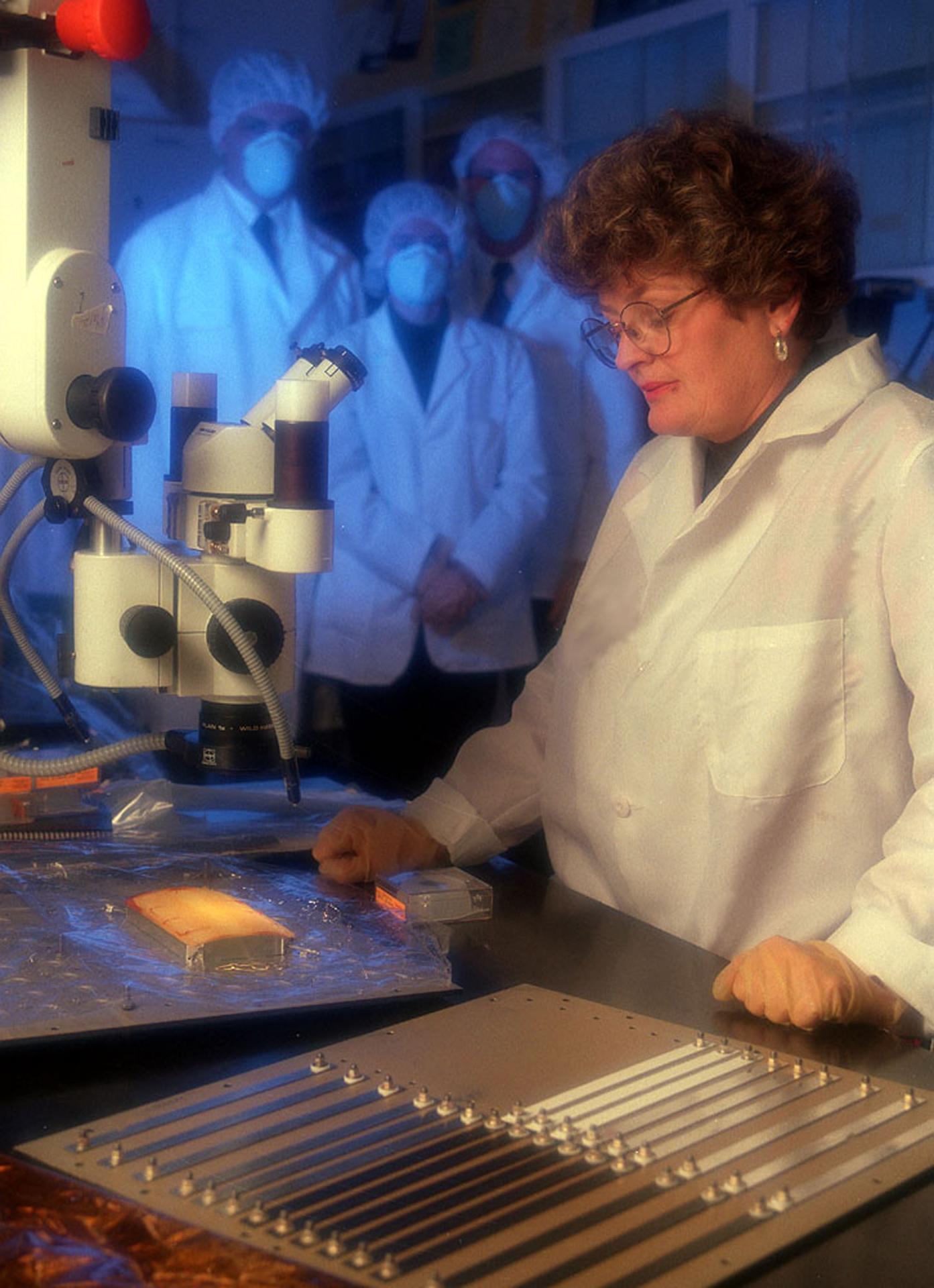 A Marshall researcher examines a sample from the Solar Array Passive Long Duration Exposure Facility (LDEF). LDEF, which flew in space, measured the number, severity, and effects of micrometeroid hits on various materials. The data will lead to improved spacecraft design in the future.