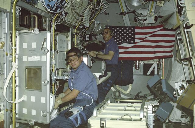 In this photograph, astronaut Eugene Trinh, a payload specialist for this mission, is working at the Drop Physics Module (DPM), and mission specialist Carl Meade is working on the experiment at the Glovebox inside the first United States Microgravity Laboratory (USML-1) Science Module. The USML-1 was one of NASA's missions dedicated to scientific investigations in a microgravity environment inside the Spacelab module. Investigations aboard the USML-1 included: materials science, fluid dynamics, biotechnology (crystal growth), and combustion science. The DPM is dedicated to the detailed study of the dynamics of fluid drops in microgravity. The Glovebox offers experimenters new capabilities and technologies in microgravity with a clean working space and minimizes contamination risks to both Spacelab and experiment samples. Payload specialists are professional scientists or engineers whose only assignment on a space flight is to carry out scientific and technological experiments. Their specific training for a space flight is usually limited to a short period of learning how to live and work in weightlessness. Mission Specialists are both professional scientists and career astronauts. Thus they are a link or bridge between the other crew members, and combine the functions of resident maintenance engineers, in-space counterparts of flight engineers in aircraft, and fully qualified scientists. The USML-1 flew aboard the STS-50 mission on June 1992, and was managed by the Marshall Space Flight Center.