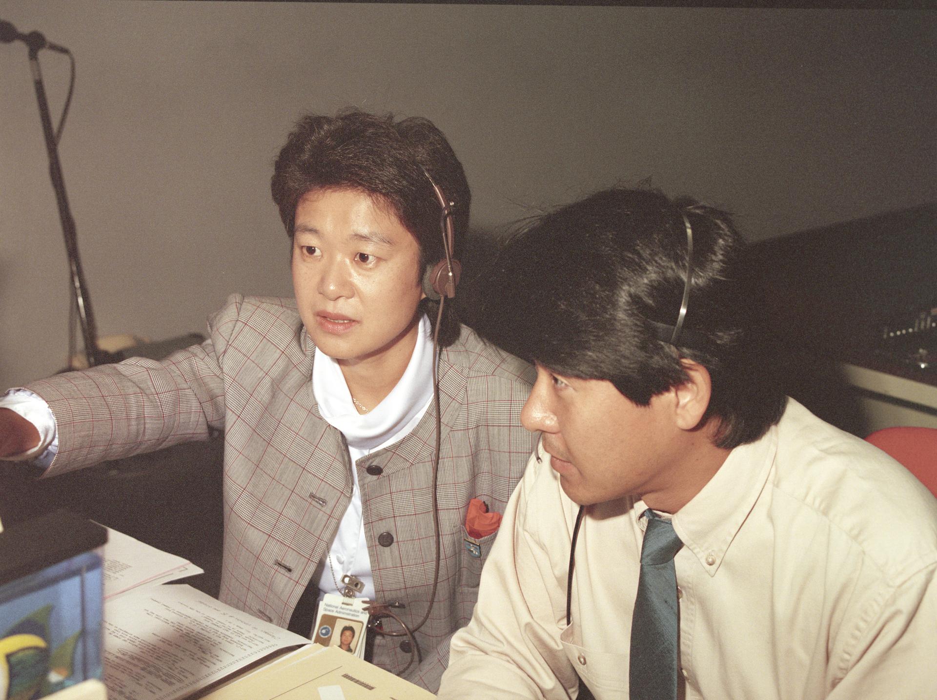 The science laboratory, Spacelab-J (SL-J), flown aboard the STS-47 flight was a joint venture between NASA and the National Space Development Agency of Japan (NASDA) utilizing a manned Spacelab module. The mission conducted 24 materials science and 20 life science experiments, of which 35 were sponsored by NASDA, 7 by NASA, and two collaborative efforts. Materials science investigations covered such fields as biotechnology, electronic materials, fluid dynamics and transport phenomena, glasses and ceramics, metals and alloys, and acceleration measurements. Life sciences included experiments on human health, cell separation and biology, developmental biology, animal and human physiology and behavior, space radiation, and biological rhythms. Test subjects included the crew, Japanese koi fish (carp), cultured animal and plant cells, chicken embryos, fruit flies, fungi and plant seeds, and frogs and frog eggs. Pictured in the Huntsville Operations Support Center (HOSC) Spacelab Payload Operations Control Center (SL POCC) of Marshall Space Flight Center (MSFC) are NASDA alternate payload specialists Dr. Doi and Dr. Mukai.
