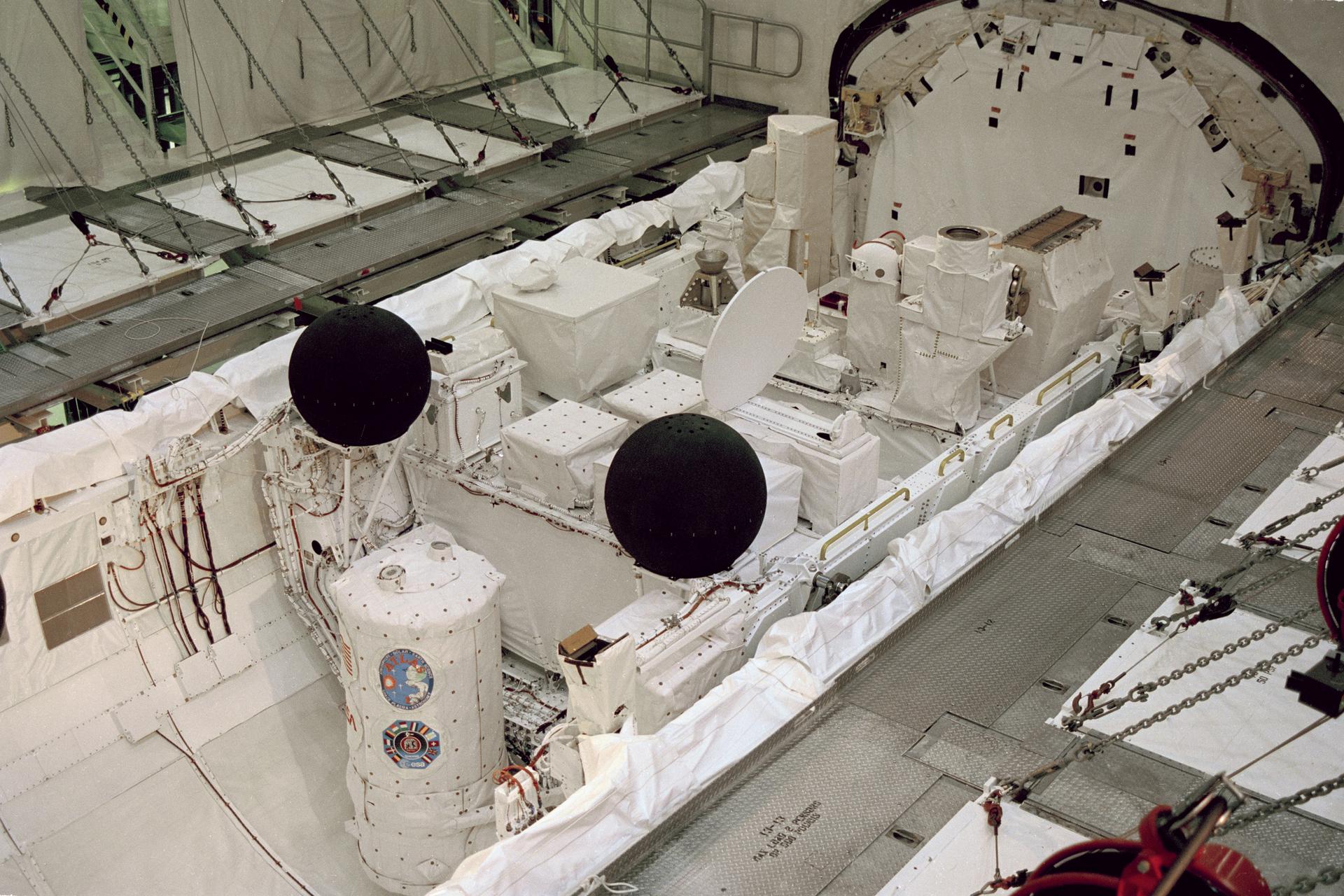 CAPE CANAVERAL, Fla. -- In bay 2 of the Orbiter processing Facility at the Kennedy Space Center in Florida, the payload bay doors are about to be closed on the space shuttle Atlantis, locking in the primary payload for its upcoming flight -- the Atmospheric Laboratory for Applications and Science-1. The payload features many elements of the spacelab modular laboratory system designed for the space shuttle program by the European Space Agency. The pallets are outfitted with an array of experiments spanning four disciplines: solar physics, atmospheric science, space plasma physics and astronomy. Atlantis is nearly ready for transfer to the Vehicle Assembly Building for mating with the external tank and solid rocket boosters. Liftoff on STS-45 is targeted for spring of 1992 from Launch Pad 39A. Photo Credit: NASA