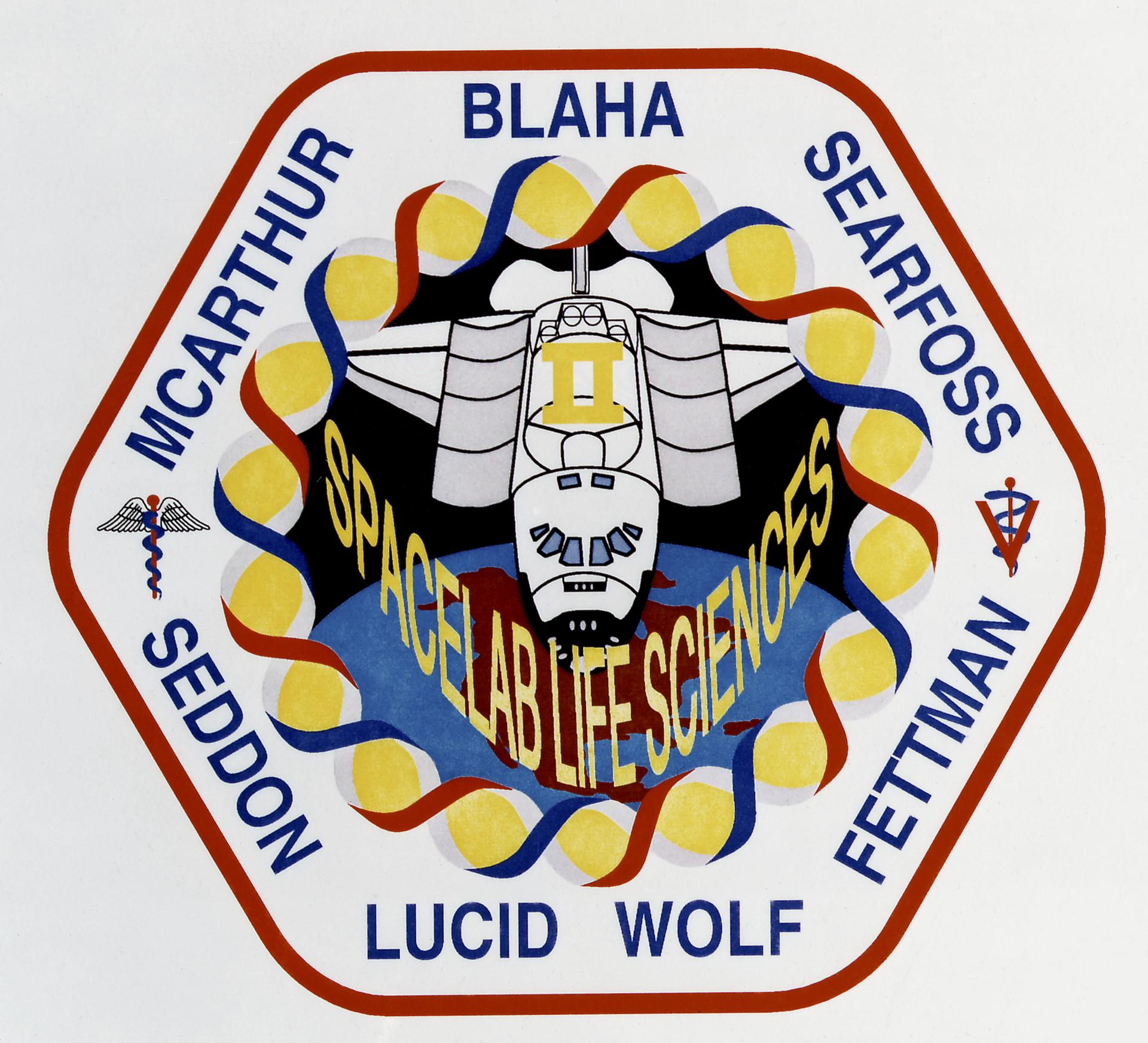 Designed by members of the flight crew, the STS-58 insignia depicts the Space Shuttle Columbia with a Spacelab module in its payload bay in orbit around Earth. The Spacelab and the lettering Spacelab Life Sciences ll highlight the primary mission of the second Space Shuttle flight dedicated to life sciences research. An Extended Duration Orbiter (EDO) support pallet is shown in the aft payload bay, stressing the scheduled two-week duration of the longest Space Shuttle mission to date. The hexagonal shape of the patch depicts the carbon ring, a molecule common to all living organisms. Encircling the inner border of the patch is the double helix of DNA, representing the genetic basis of life. Its yellow background represents the sun, energy source for all life on Earth. Both medical and veterinary caducei are shown to represent the STS- 58 life sciences experiments. The position of the spacecraft in orbit about Earth with the United States in the background symbolizes the ongoing support of the American people for scientific research intended to benefit all mankind.