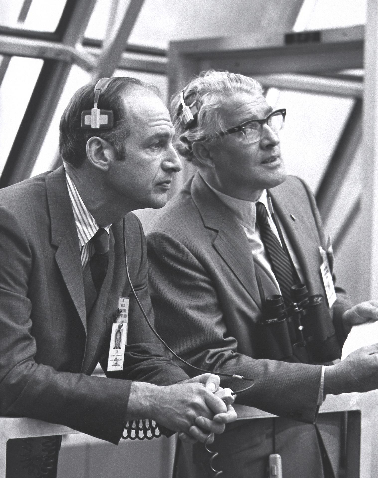 Dr. George M. Lowe, left, Acting Administrator of NASA, and Dr. von Braun monitor the Apollo 14 prelaunch activities in the Firing Room of the Launch Control Center at the Kennedy Space Center.