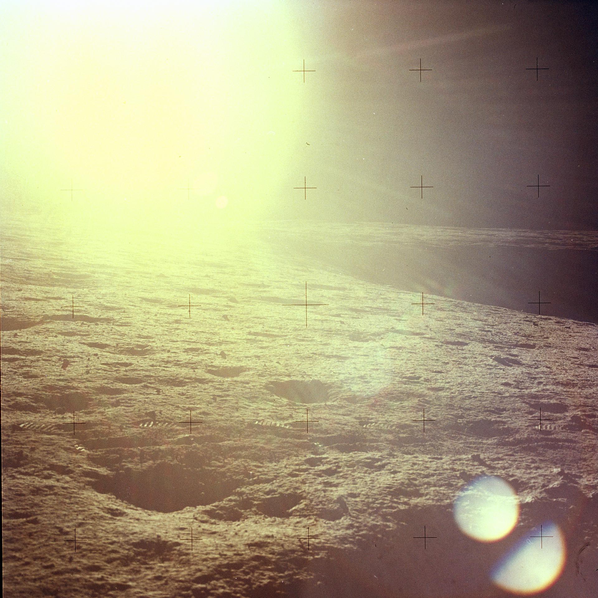 The second manned lunar landing mission, Apollo 12, launched from launch pad 39-A at Kennedy Space Center in Florida on November 14, 1969 via a Saturn V launch vehicle. The Saturn V vehicle was developed by the Marshall Space Flight Center (MSFC) under the direction of Dr. Wernher von Braun. Aboard Apollo 12 was a crew of three astronauts: Alan L. Bean, pilot of the Lunar Module (LM), Intrepid; Richard Gordon, pilot of the Command Module (CM), Yankee Clipper; and Spacecraft Commander Charles Conrad. The LM, Intrepid, landed astronauts Conrad and Bean on the lunar surface in what’s known as the Ocean of Storms while astronaut Richard Gordon piloted the CM, Yankee Clipper, in a parking orbit around the Moon. Lunar soil activities included the deployment of the Apollo Lunar Surface Experiments Package (ALSEP), finding the unmanned Surveyor 3 that landed on the Moon on April 19, 1967, and collecting 75 pounds (34 kilograms) of rock samples. This is the fifteenth of 25 images captured by the crew in attempt to provide a 360 degree Lunar surface scene. Apollo 12 safely returned to Earth on November 24, 1969.