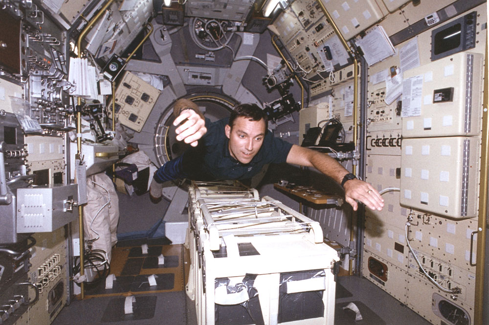 Astronaut Carl E. Walz, mission specialist, flies through the second International Microgravity Laboratory (IML-2) science module, STS-65 mission. IML was dedicated to study fundamental materials and life sciences in a microgravity environment inside Spacelab, a laboratory carried aloft by the Shuttle. The mission explored how life forms adapt to weightlessness and investigated how materials behave when processed in space. The IML program gave a team of scientists from around the world access to a unique environment, one that is free from most of Earth's gravity. Managed by the NASA Marshall Space Flight Center, the 14-nation European Space Agency (ESA), the Canadian Space Agency (SCA), the French National Center for Space Studies (CNES), the German Space Agency and the German Aerospace Research Establishment (DARA/DLR), and the National Space Development Agency of Japan (NASDA) participated in developing hardware and experiments for the IML missions. The missions were managed by NASA's Marshall Space Flight Center. The Orbiter Columbia was launched on July 8, 1994 for the IML-2 mission.