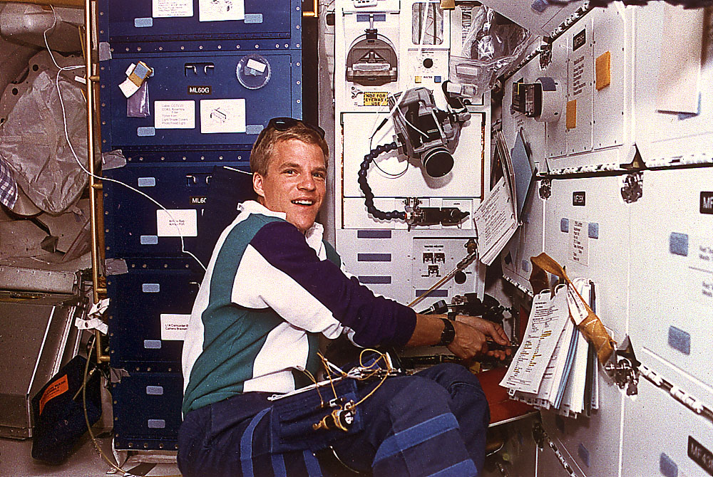 This is an onboard photo of space shuttle Atlantis (STS-66) astronaut Scott E. Parazynski, in the International Microgravity Laboratory (IML), performing a series of experiments devoted to material and life sciences studies using the Spacelab Long Module (SLM). STS-066 was launched on November 3, 1994.