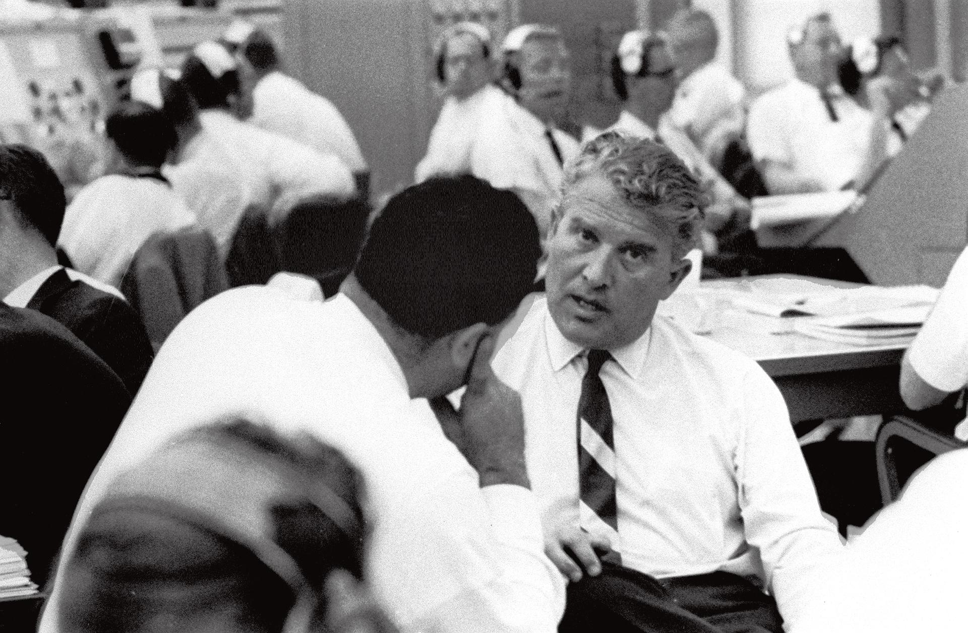 In this photograph at Kennedy Space Center (KSC) Complex 37 Control Center, Marshall Space Flight Center (MSFC) Director Wernher von Braun (right) talks with KSC's Rocco Petrone while awaiting the launch of SA-8 (Saturn I) on May 25, 1965. Petrone played key roles at KSC in the development of Saturn launch facilities before becoming the director of launch operations in 1966.