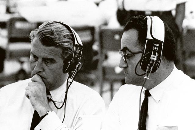 Marshall Space Flight Center (MSFC) Director Dr. Wernher von Braun (left) with Kennedy Space Center (KSC) Rocco Petrone prior to the January 29, 1964 launch of SA-5, the first Block II configuration of the Saturn I launch vehicle. Petrone played key roles at KSC in the development of Saturn launch facilities before becoming director of launch operations in 1966.