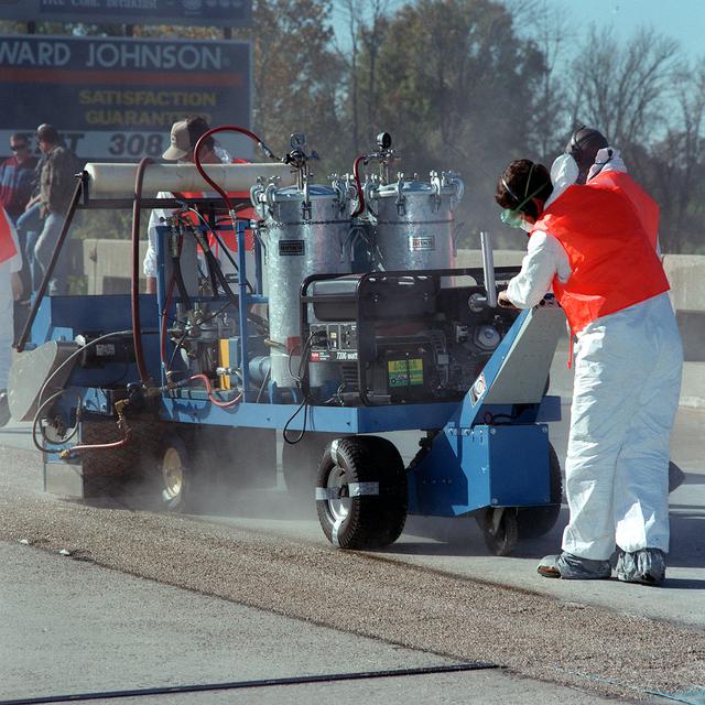 Alabama Department of Transportation workers utilize Convergent Spray Technology to resurface a bridge on Interstate 65 near Lacon, Alabama. Originally developed by USBI to apply a heat resistant coating to the Space Shuttle's Solid Rocket Boosters, the environment-friendly technology reduces the required worktime from days to hours.