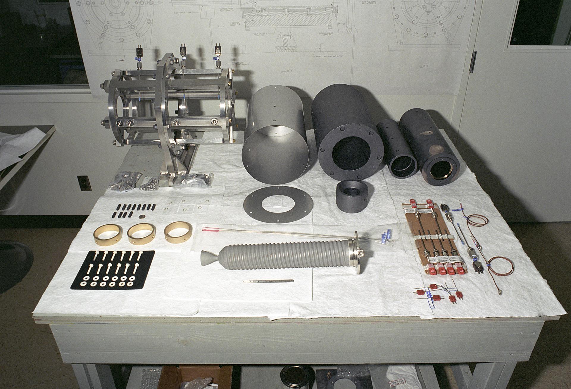 Researchers at the Marshall Space Flight Center (MSFC) have designed, fabricated, and tested the first solar thermal engine, a non-chemical rocket engine that produces lower thrust but has better thrust efficiency than a chemical combustion engine. This photograph shows components for the thermal propulsion engine being laid out prior to assembly. MSFC turned to solar thermal propulsion in the early 1990s due to its simplicity, safety, low cost, and commonality with other propulsion systems. As part of MSFC's Space Transportation Directorate, the Propulsion Research Center serves as a national resource for research of advanced, revolutionary propulsion technologies. The mission is to move the Nation's capabilities beyond the confines of conventional chemical propulsion into an era of aircraft-like access to Earth-orbit, rapid travel throughout the solar system, and exploration of interstellar space.