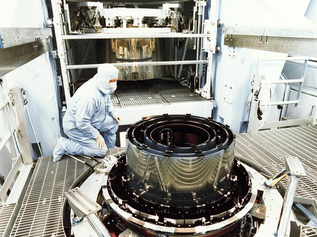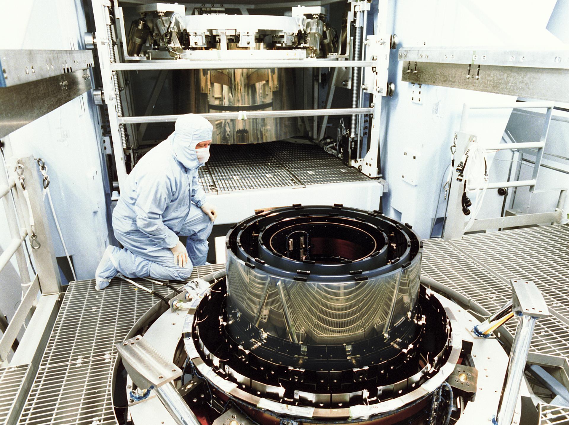 This photograph shows the mirrors of the High Resolution Mirror Assembly (HRMA) for the Chandra X-Ray Observatory (CXO), formerly Advanced X-Ray Astrophysics Facility (AXAF), being assembled in the Eastman Kodak Company in Rochester, New York. The AXAF was renamed CXO in 1999. The CXO is the most sophisticated and the world's most powerful x-ray telescope ever built. It observes x-rays from high-energy regions of the universe, such as hot gas in the remnants of exploded stars. The HRMA, the heart of the telescope system, is contained in the cylindrical "telescope" portion of the observatory. Since high-energy x-rays would penetrate a normal mirror, special cylindrical mirrors were created. The two sets of four nested mirrors resemble tubes within tubes. Incoming x-rays graze off the highly polished mirror surface and are furneled to the instrument section for detection and study. TRW, Inc. was the prime contractor for the development of the CXO and NASA's Marshall Space Flight Center was responsible for its project management. The Observatory was launched July 22, 1999 aboard the Space Shuttle Columbia, STS-93 mission.