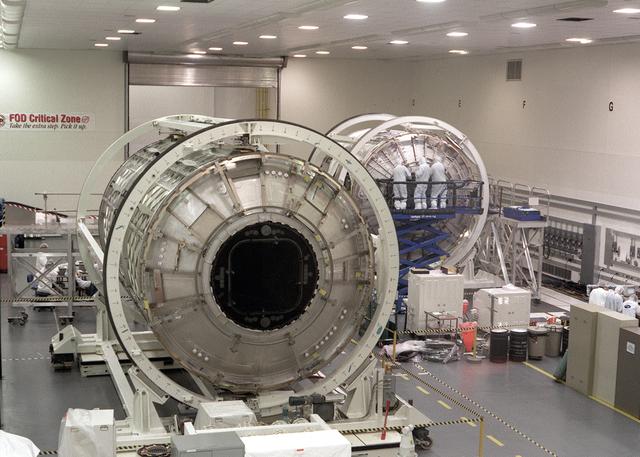 This Boeing photograph shows the Node 1, Unity module, Flight Article (at right) and the U.S. Laboratory module, Destiny, Flight Article for the International Space Station (ISS) being manufactured in the High Bay Clean Room of the Space Station Manufacturing Facility at the Marshall Space Flight Center. The Node 1, or Unity, serves as a cornecting passageway to Space Station modules. The U.S. built Unity module was launched aboard the orbiter Endeavour (STS-88 mission) on December 4, 1998 and connected to the Zarya, the Russian-built Functional Energy Block (FGB). The U.S. Laboratory (Destiny) module is the centerpiece of the ISS, where science experiments will be performed in the near-zero gravity of space. The U.S. Laboratory/Destiny was launched aboard the orbiter Atlantis (STS-98 mission) on February 7, 2001. The ISS is a multidisciplinary laboratory, technology test bed, and observatory that will provide unprecedented undertakings in scientific, technological, and international experimentation.