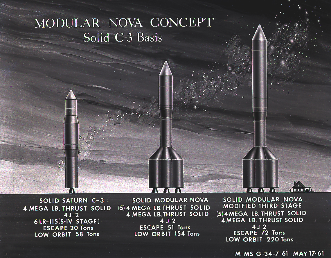 This artist's concept illustrates the Module Nova concept - Solid C-3 Basis. From 1960 to 1962, the Marshall Space Flight Center considered the Nova launch vehicle as a means to achieve a marned lunar landing with a direct flight to the Moon. Various configurations of the vehicle were examined. The latest configuration was a five-stage vehicle using eight F-1 engines in the first stage. Although the program was canceled after NASA planners selected the lunar/orbital rendezvous mode, the proposed F-1 engine would eventually be used in the Apollo Program to propel the first stage of the Saturn V launch vehicle.