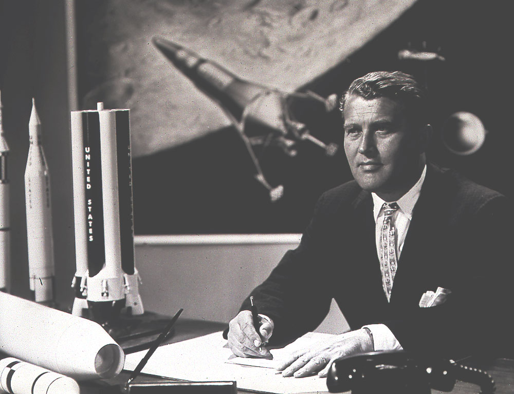 Dr. Wernher von Braun, Marshall's first Center Director (1960-1970), in his office with illustrations of rocket models behind him.