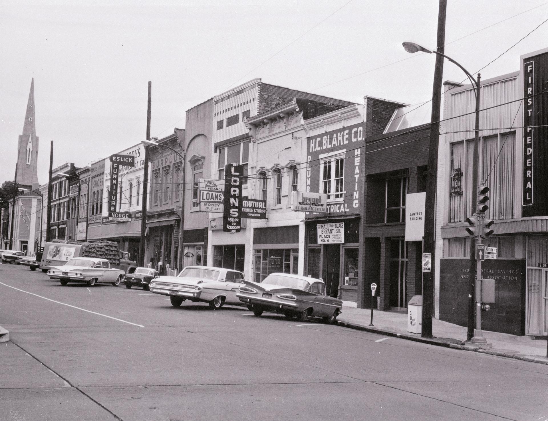 This historical photo of the South side of Square in downtown Huntsville, Alabama was taken in 1965. (Courtesy of Huntsville/Madison County Public Library)