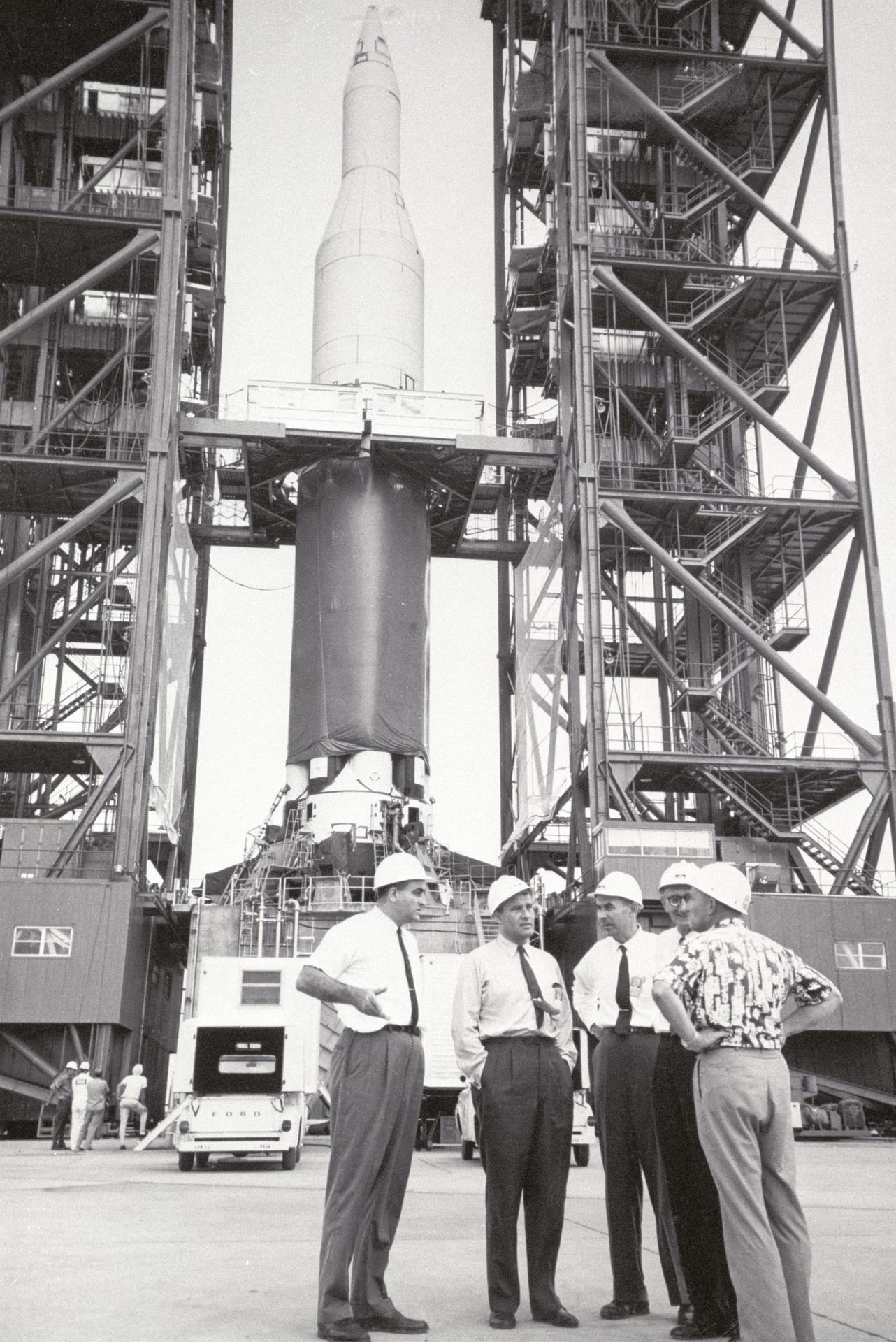 Pictured in front of the Saturn 1 launch vehicle are (L to R): Dr. Rocco Petrone, Director of Launch Operations at Kennedy Space Center; Dr. Werher von Braun, Director of Marshall Space Flight Center; Dr. Oswald Lange, Director of the Saturn Systems Office; Mr. Hans. H. Maus, Director of Fabrication and Assembly Engineering Division; and Dr. Hans Gruene, Deputy Director of Launch Operations Directorate. Maus and Gruene were original members of von Braun's rocket team.