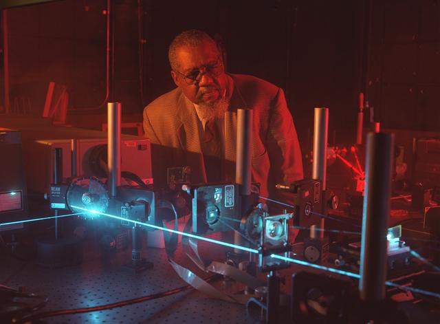NASA researcher Dr. Donald Frazier uses a blue laser shining through a quartz window into a special mix of chemicals to generate a polymer film on the inside quartz surface. As the chemicals respond to the laser light, they adhere to the glass surface, forming optical films. Dr. Frazier and Dr. Mark S. Paley developed the process in the Space Sciences Laboratory at NASA's Marshall Space Flight Center in Huntsville, AL. Working aboard the Space Shuttle, a science team led by Dr. Frazier formed thin-films potentially useful in optical computers with fewer impurities than those formed on Earth. Patterns of these films can be traced onto the quartz surface. In the optical computers of the future, thee films could replace electronic circuits and wires, making the systems more efficient and cost-effective, as well as lighter and more compact. Photo credit: NASA/Marshall Space Flight Center