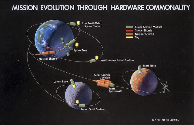 In this artist's concept from 1970, propulsion concepts such as the Nuclear Shuttle and Space Tug are shown in conjunction with other proposed spacecraft. As a result of the recommendations from President Nixon's Space Task Group for more commonality and integration in the American space program, Marshall Space Flight engineers studied many of the spacecraft depicted here.
