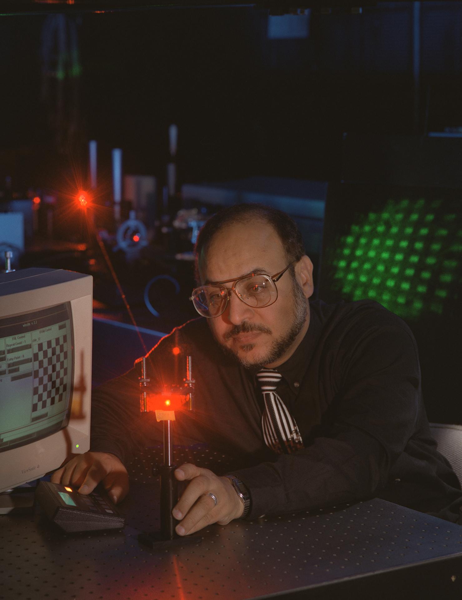 Looking for a faster computer? How about an optical computer that processes data streams simultaneously and works with the speed of light? In space, NASA researchers have formed optical thin-film. By turning these thin-films into very fast optical computer components, scientists could improve computer tasks, such as pattern recognition. Dr. Hossin Abdeldayem, physicist at NASA/Marshall Space Flight Center (MSFC) in Huntsville, Al, is working with lasers as part of an optical system for pattern recognition. These systems can be used for automated fingerprinting, photographic scarning and the development of sophisticated artificial intelligence systems that can learn and evolve. Photo credit: NASA/Marshall Space Flight Center (MSFC)