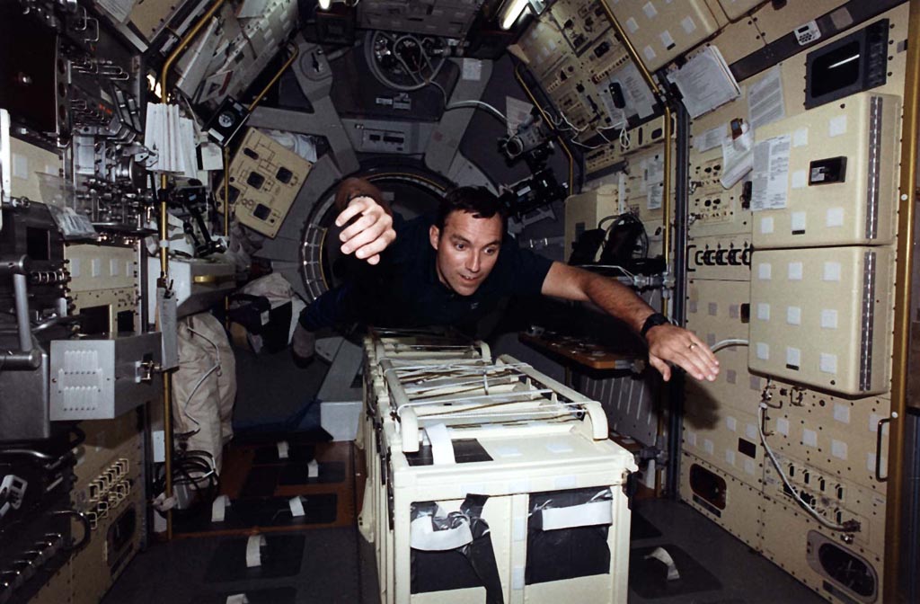 Astronaut Carl E. Walz, mission specialist, enters the International Microgravity Laboratory (IML-2) science module in the cargo bay via the turnel connecting it to Columbia's cabin. Walz joined five other NASA astronauts and a Japanese payload specialist for more than two weeks of experimenting in Earth orbit.