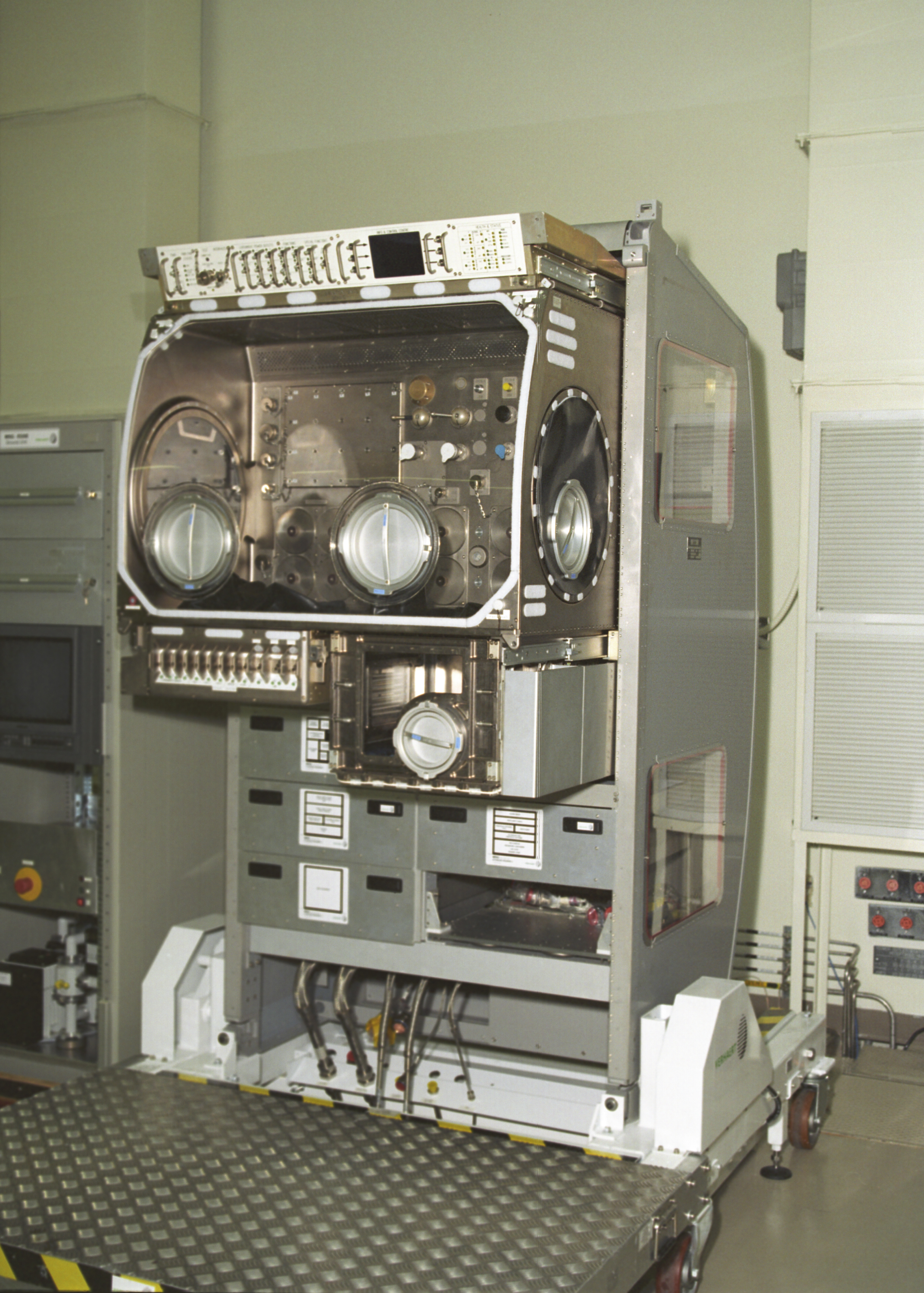 The Microgravity Science Glovebox Ground Unit, delivered to the Marshall Space Flight Center on August 30, 2002, will be used at Marshall's Microgravity Development Laboratory to test experiment hardware before it is installed in the flight glovebox aboard the International Space Station (ISS) U.S. Laboratory Module, Destiny. The glovebox is a sealed container with built in gloves on its sides and fronts that enables astronauts to work safely with experiments that involve fluids, flames, particles, and fumes that need to be safely contained.