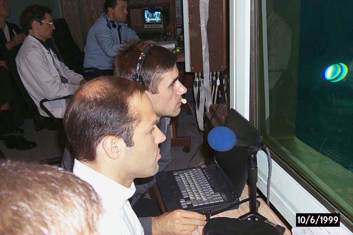 99-E-14652 (6 October 1999) --- Cosmonaut Yuri I. Malenchenko, center, monitors a space walk rehearsal in the Hydrolab facility at Star City, Russia. Also looking on is Michael Hess (foreground), NASA's mission EVA officer. The aquarium-like viewing windows allow observers to be on eye-level with the astronauts training in the pool. The STS-106 crew is currently in Russia preparing for its scheduled visit to the International Space Station (ISS).