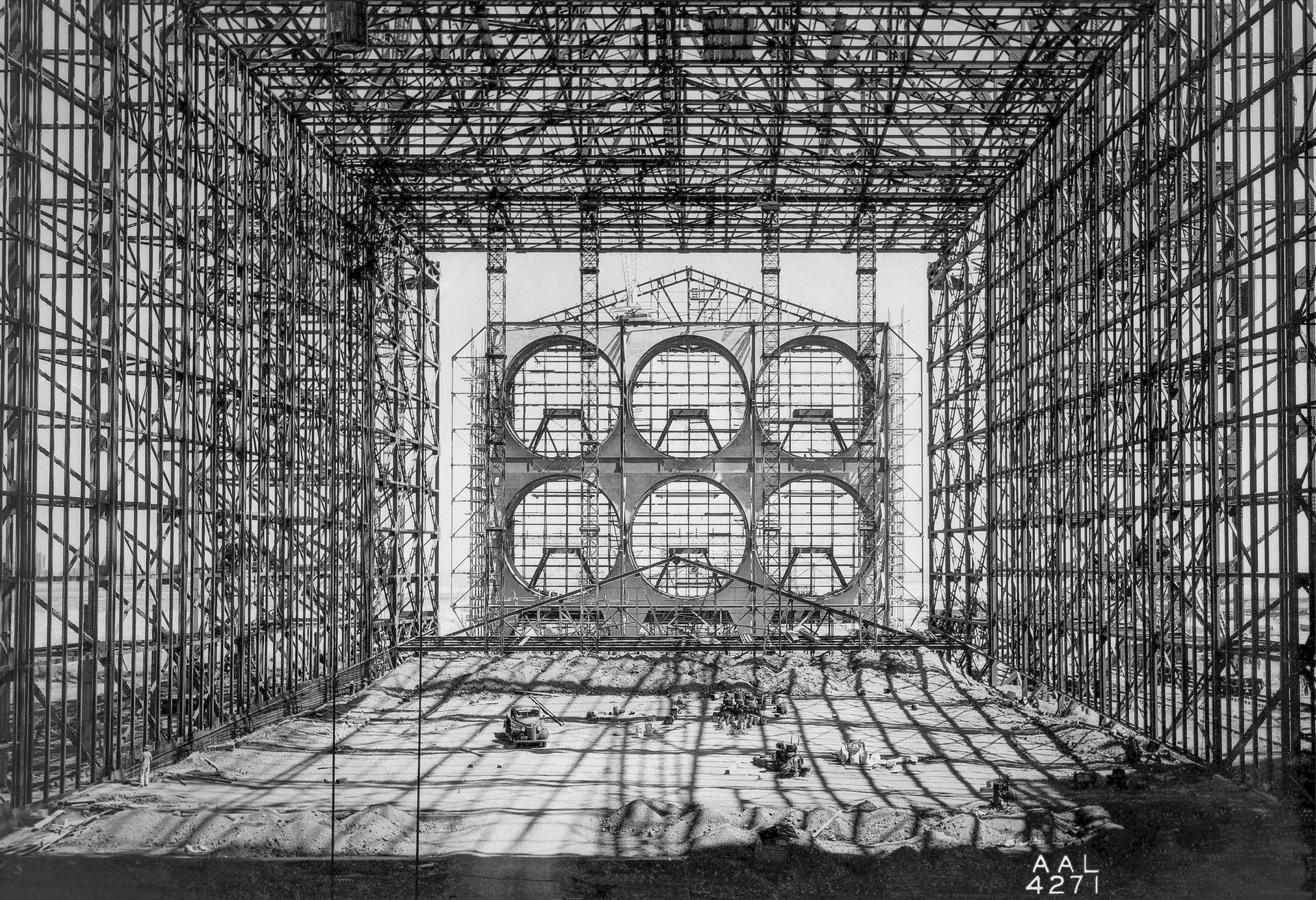 Looking South from inside the diffuser of the 40x80 foot wind tunnel at NACA's Ames Research Center. Construction began in late 1941, the mammoth construction task sorely taxing the resources of the new center. Two and a half years later, in dune 1944, the 40 x 80-foot full-scale tunnel went into operation.