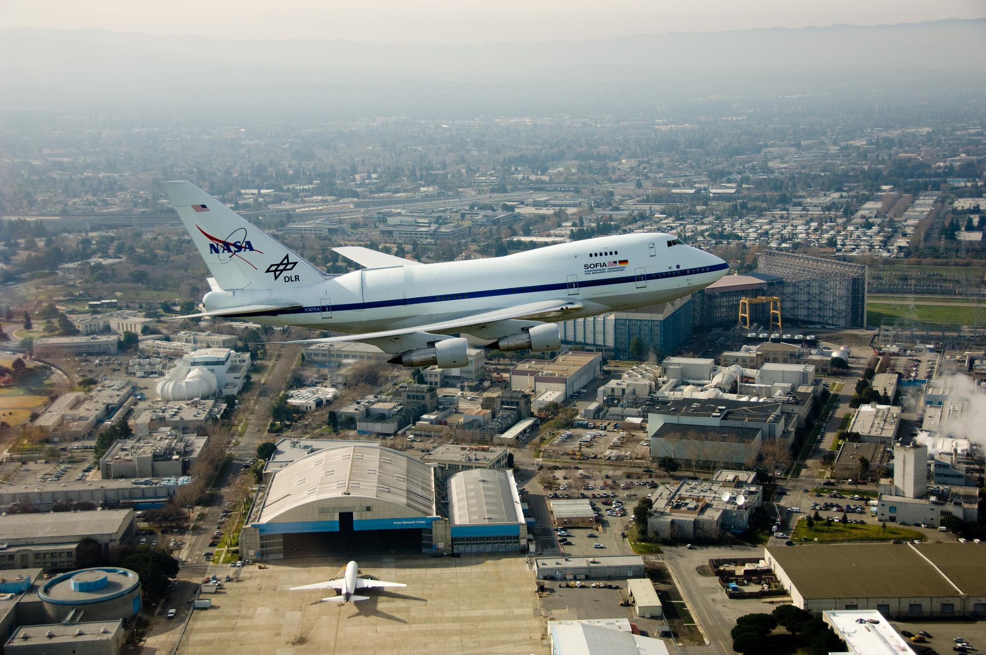 Air to air view of the Stratospheric Observatory for Infrared Astronomy or SOFIA aircraft fly-by on a visit to Ames Research Center